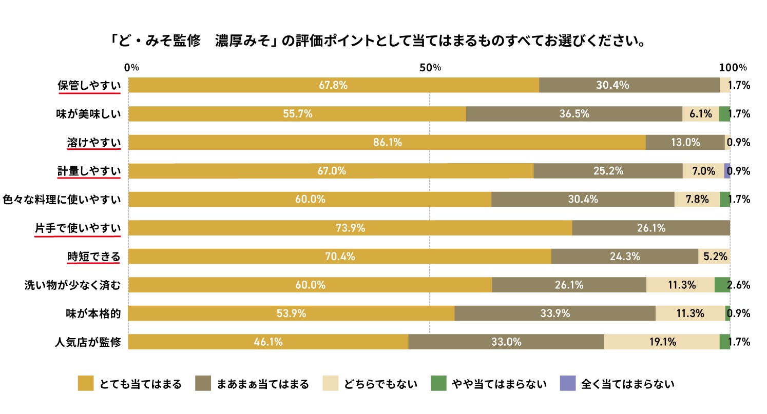テストモニターで、「濃厚みそ」の味や使い勝手など10項目について「とても当てはまる」~「まったく当てはまらない」の5段階で評価してもらいました。その結果、「とても当てはまる」の回答率が高かった評価項目は、「溶けやすい」(86.1%)が最多となり、次いで「片手で使いやすい」(73.9%)「時短できる」(70.4%)「保管しやすい」(67.8%)「計量しやすい」(67.0%)となり、生みそにはない液みそならではの特徴が高く評価されていることがわかりました。