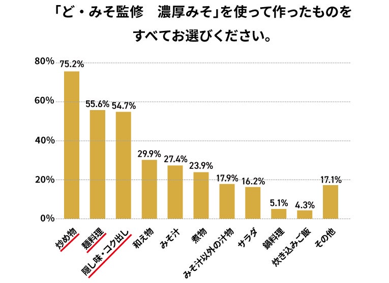 料理SNS「スナップディッシュ」を運営するスナップディッシュ株式会社(本社:東京都武蔵野市、代表取締役:舟田善)協力のもと、同アプリのユーザーを対象に発売前の「液みそ ど・みそ監修 濃厚みそ」でテストモニターを実施しました。「濃厚みそ」を使った料理を回答してもらったところ、「炒め物」(75.2%)、「麺料理」(55.6%)、「隠し味・コク出し」(54.7%)が上位となりました。「その他」の回答では手づくりのソースやタレ、つけだれやディップなどに非加熱のまま使用する場合や、焼きおにぎりなどの焼き物、肉や魚の下味など、「万能調味料」として幅広い用途に使われていました。
