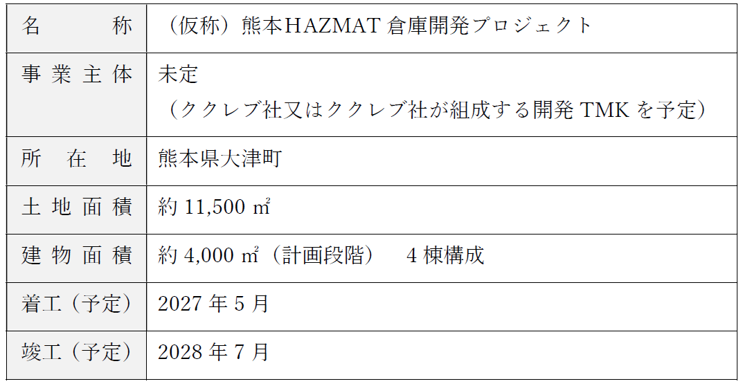 株式会社ecoプロパティーズ(本社:東京都千代田区、代表取締役 福島雅、以下「当社」)は、熊本県大津町にて複数棟から構成される賃貸型危険物倉庫(以下「HAZMAT(注)倉庫」といいます。)の開発プロジェクト(以下「本PJ」といいます。)について、ククレブ・アドバイザーズ株式会社(本社:東京都千代田区、代表取締役 宮寺之裕、以下「ククレブ社」)と共同で着手することをお知らせいたします。