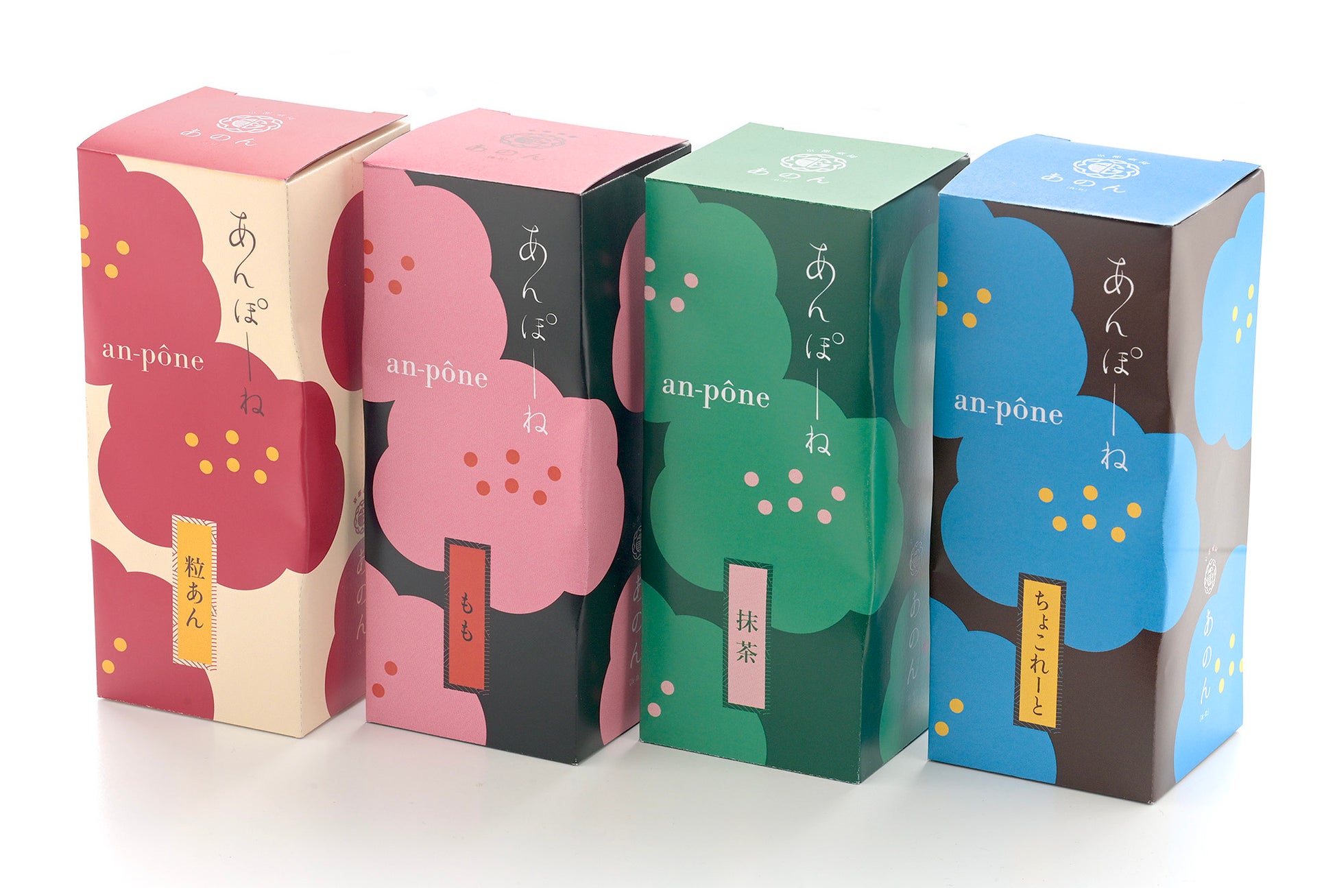 あのんのブランド柄「牡丹の花」をポップにアレンジし、味ごとのカラー展開が可愛らしいデザインに仕上げました。
