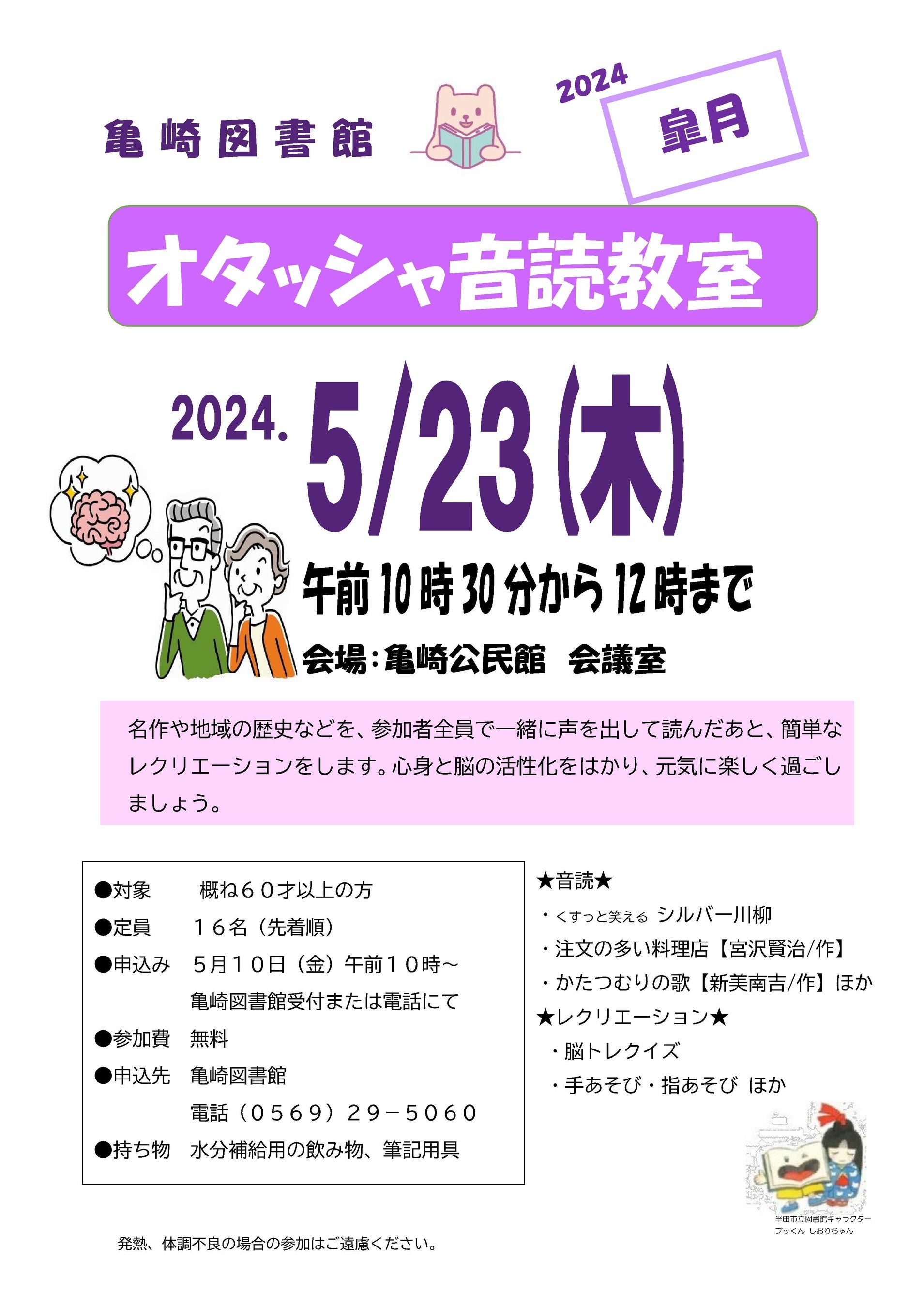 音読で心身の健康を活性化しよう!『亀崎図書館オタッシャ音読教室2024皐月」』を開催します。
