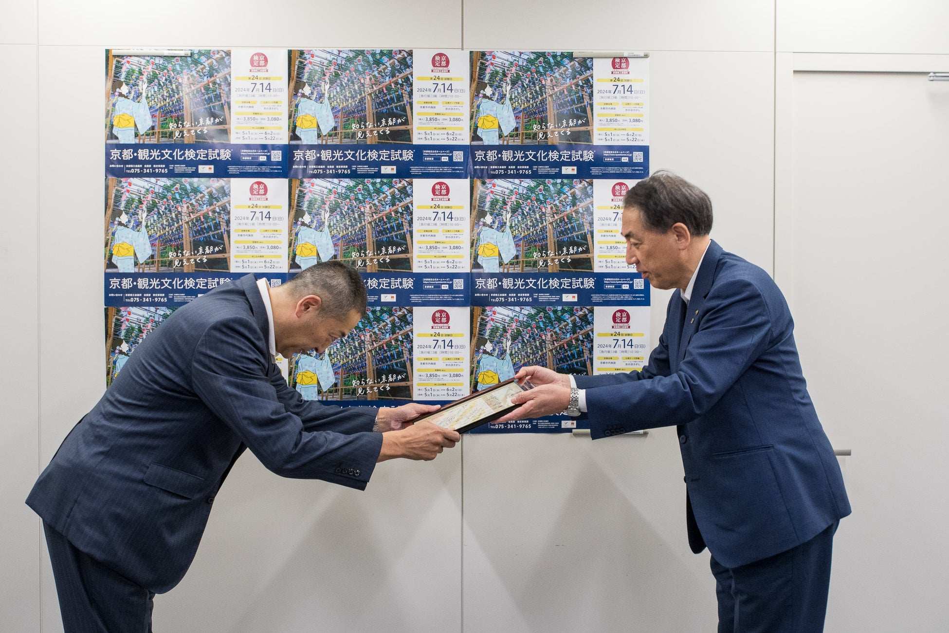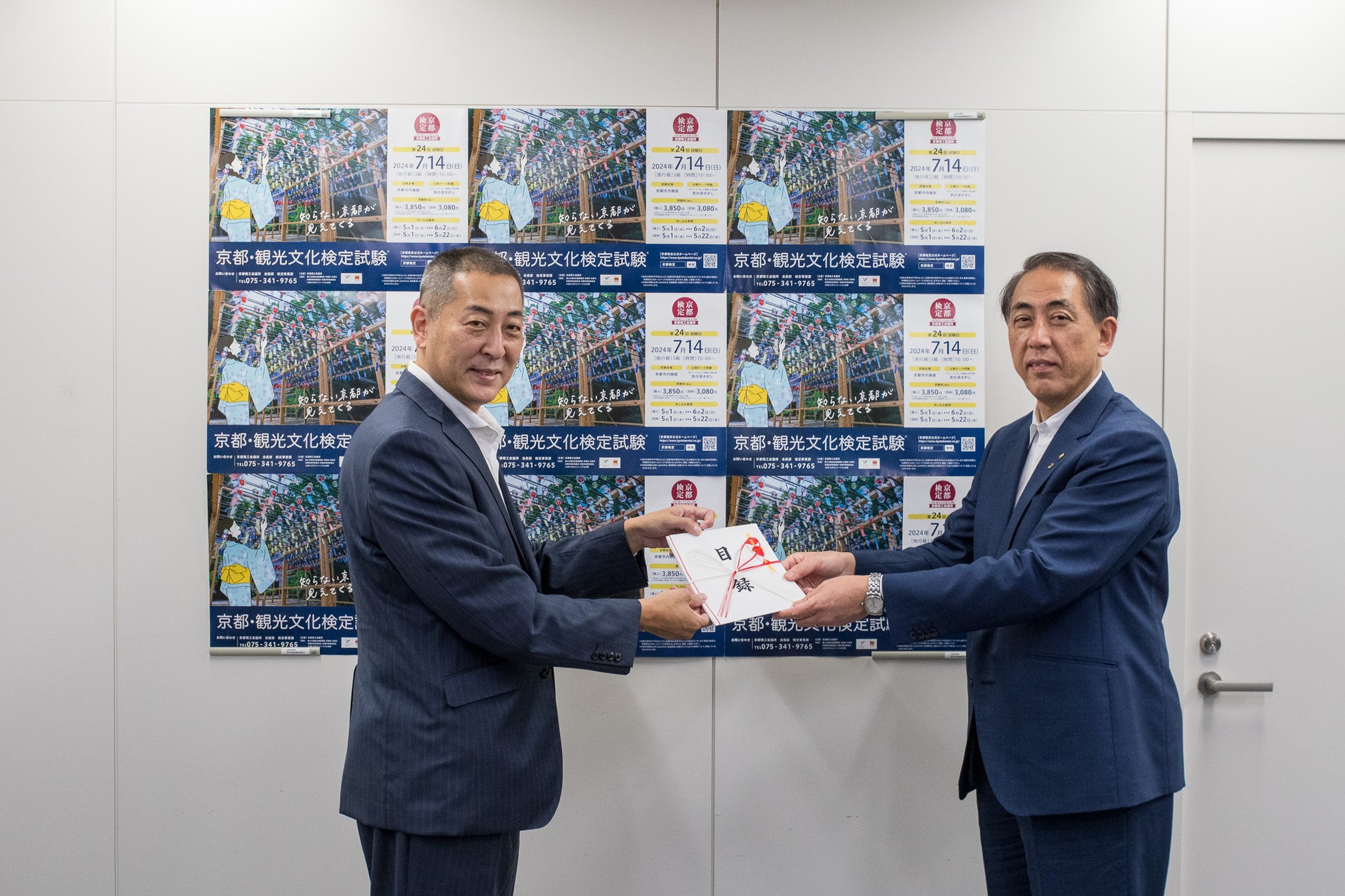 寄付受納式には京都市教育委員会から稲田教育長、宮前生涯学習部長、京都商工会議所から窪田常務理事が出席され、稲田新吾京都市教育長に弊社代表取締役社長の粂田晃稔が目録を贈呈し、感謝状をいただきました。