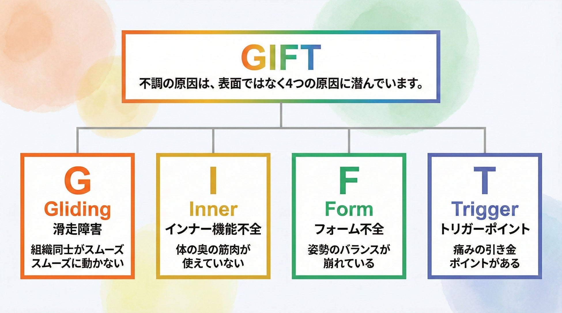 GIFTは、身体の不調の原因を4つの視点から多角的に分析するための施術メソッドです。名称は以下の4つの頭文字に由来します。