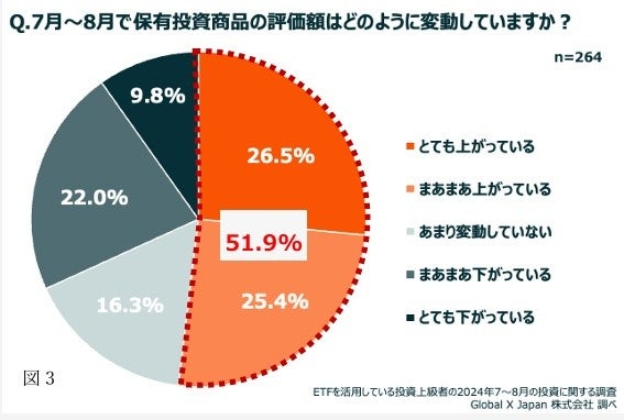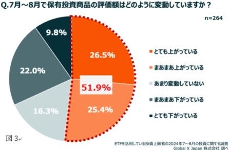 株価の乱高下の影響で、自身の保有投資商品の評価額に影響が出た人も多くいると思いますが、今回調査をした投資上級者の半数以上(51.9%)は7〜8月で自身の保有投資商品の評価額が上がっていると回答しました。変動していない人も合わせると約7割の方は評価額を下げずに運用していたことが分かりました。(図3)