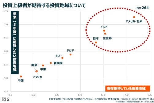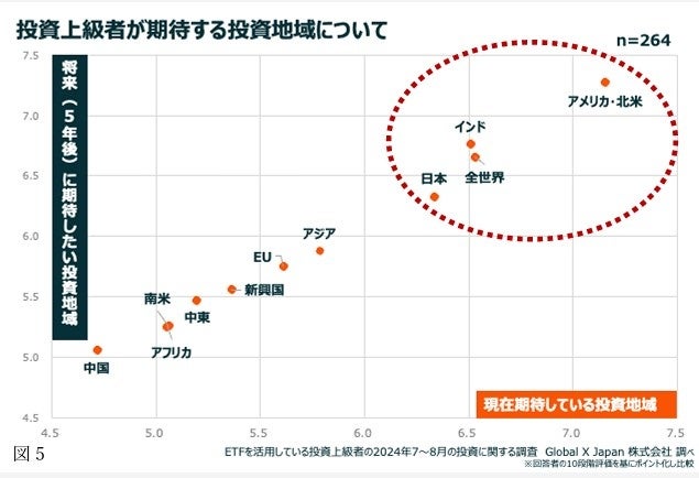 また投資地域については、現在も将来も「アメリカ・北米」が特に期待度が高く、その他は当社でも今年に上場した「インド」や「全世界」「日本」への期待が高いことが分かりました。(図5)