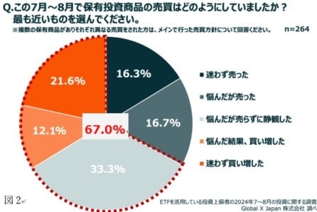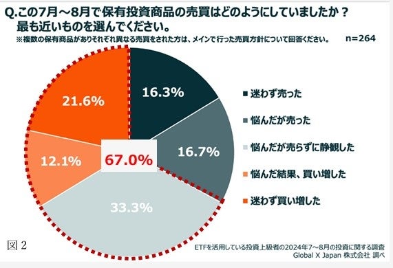 このように半数が不安に思う状況でも、実際に売却した人は3割程度に留まりました。一方、約7割は静観、または投資商品を買い増していました。また「迷わず買い増した」との回答も2割以上おり、投資上級者の多くが、7〜8月の株価乱高下を、“売らない”で対応していたことが分かりました。 中長期での投資をしやすいETFを活用している上級者ならではの選択であることが推測できます (図2)