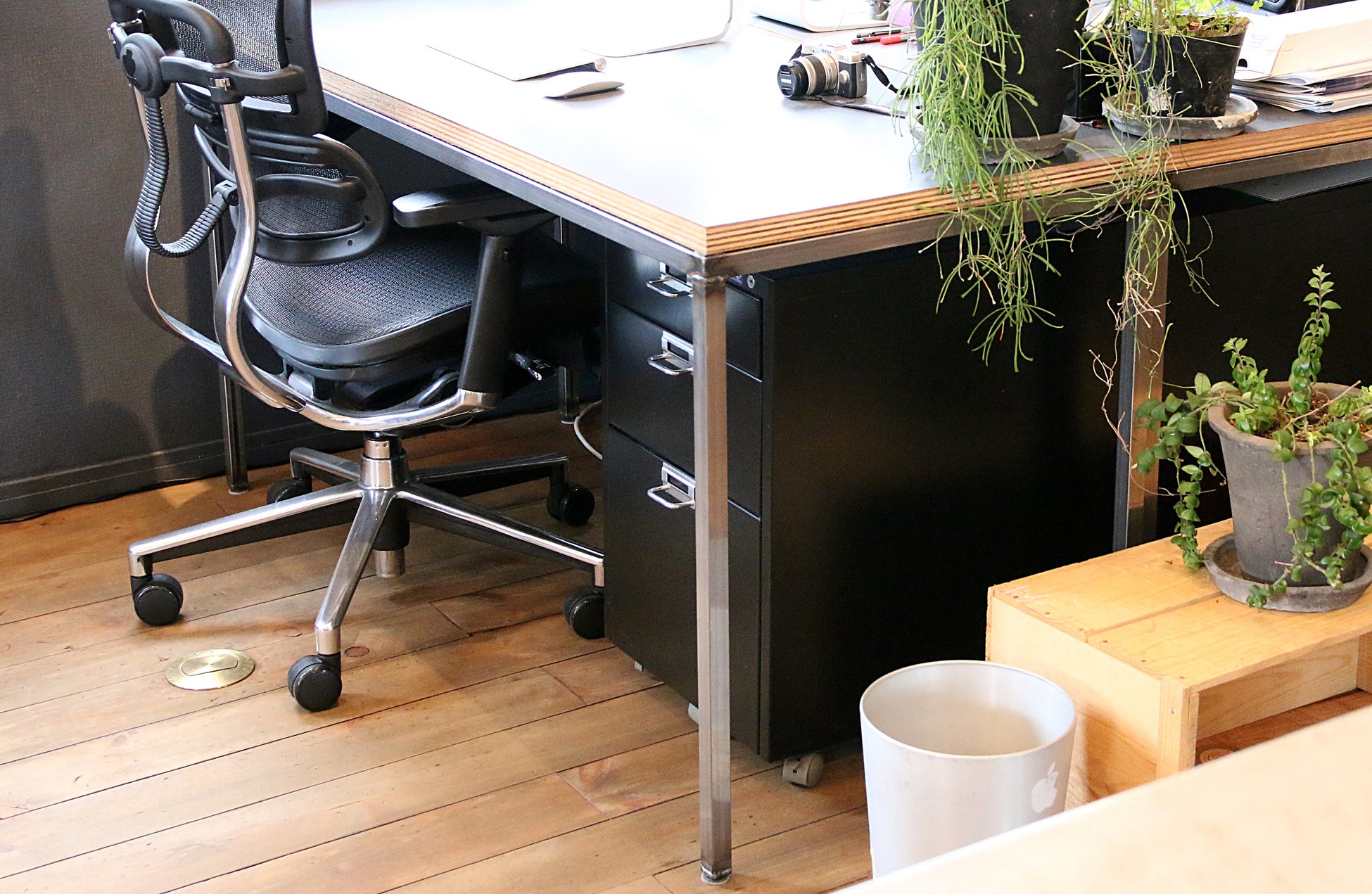 ピンと立ったエッジ、薄く軽やかな見た目。実際にはしっかりとした強度があり、幕板のある構造で大きな天板にも対応します。付属の六角レンチで組立、解体ができるノックダウン式です。
