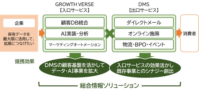 当社は、中期経営計画において将来のありたい姿として、主力事業であるダイレクトメールの枠組みを超えたデジタルとリアルの「総合情報ソリューション企業」への変貌を掲げており、その実現に向けた取組みの一環として、2023 年より、当社とGROWTH VERSE の事業の強みを活かし、データ・AI