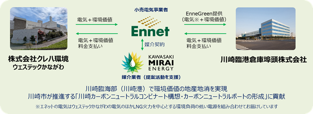 発電した電気のバイオマス由来分(再生可能エネルギーに相当)の川崎市内での活用を模索していたクレハ環境とその電気と環境価値を調達しているエネットが、地域のエネルギープラットフォームの役割をめざす川崎未来エナジーと連携し、カーボンニュートラルの取組に積極的な川崎臨港倉庫埠頭へ提案を行うことにより、川崎臨海部(川崎港)で実質再エネ電力の活用による地産地消を実現しました。