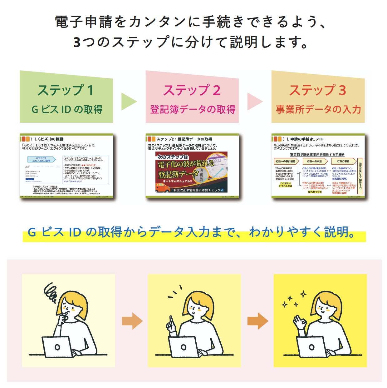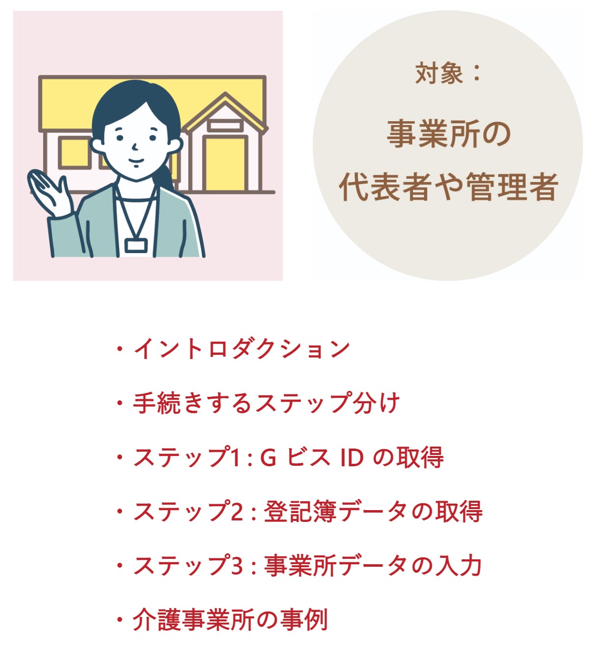 ・そこで事業所サポートプランでは、介護事業所での電子申請の利用にフォーカスし、電子申請をステップごとに分けて、その手続きをスライドや動画などで解説しています。例)解説スライド、操作手順の動画、ケース事例など