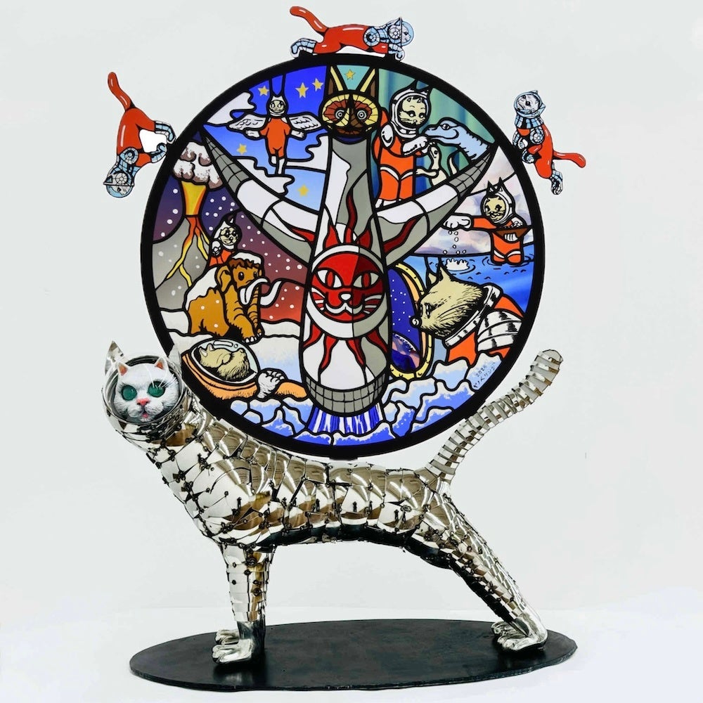 ヨーロッパ製の色ガラス使用し、ヤノベ本人が筆入れをした光を通す絵画がステンレス彫刻の土台に鎮座。工芸職人的技巧で宇宙猫神話のモニュメントが具現化されています。