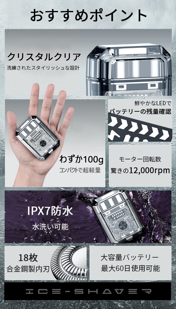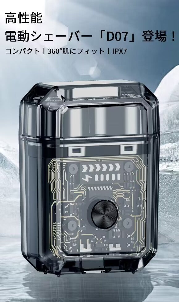 「D07」は伝統的な髭剃りのデザインを覆し、宝石のような透明感と機械的な美しさの新世代画面可視化電動シェーバーです。さらに、手のひらに収まるコンパクトサイズなので、持ち運びもとても便利!