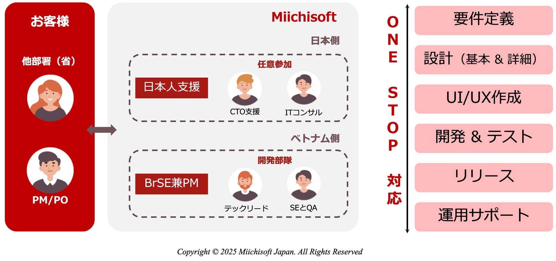 実務経験豊富な日本人アドバイザー、ビジネスコンサルティング能力、そしてプロフェッショナルなベトナム開発チームを組み合わせることで、複雑な業務を持つプロジェクトにも対応可能な体制を構築しています。