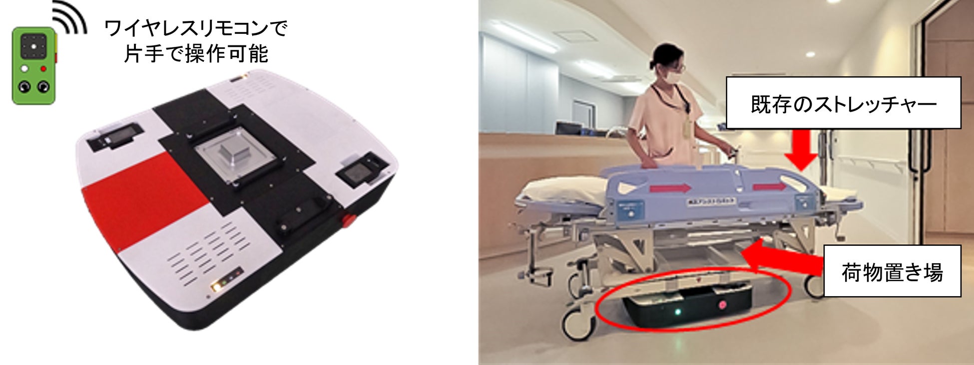 また本ロボットの特徴として、既存のストレッチャーにアタッチメントを取り付けるだけで装着できるため、ロボット導入時に発生するコストや負担を軽減できます。また、リモコンを使って一度のボタンで着脱を行うことができます。引き続きユーザの声をもとにした製品改良を重ねていき、今後はベッド搬送やリネンサプライなどの搬送にも適用拡大していく予定です。将来的には病院・医療現場以外に向けた多用途搬送支援ロボットとしても提案していきます。