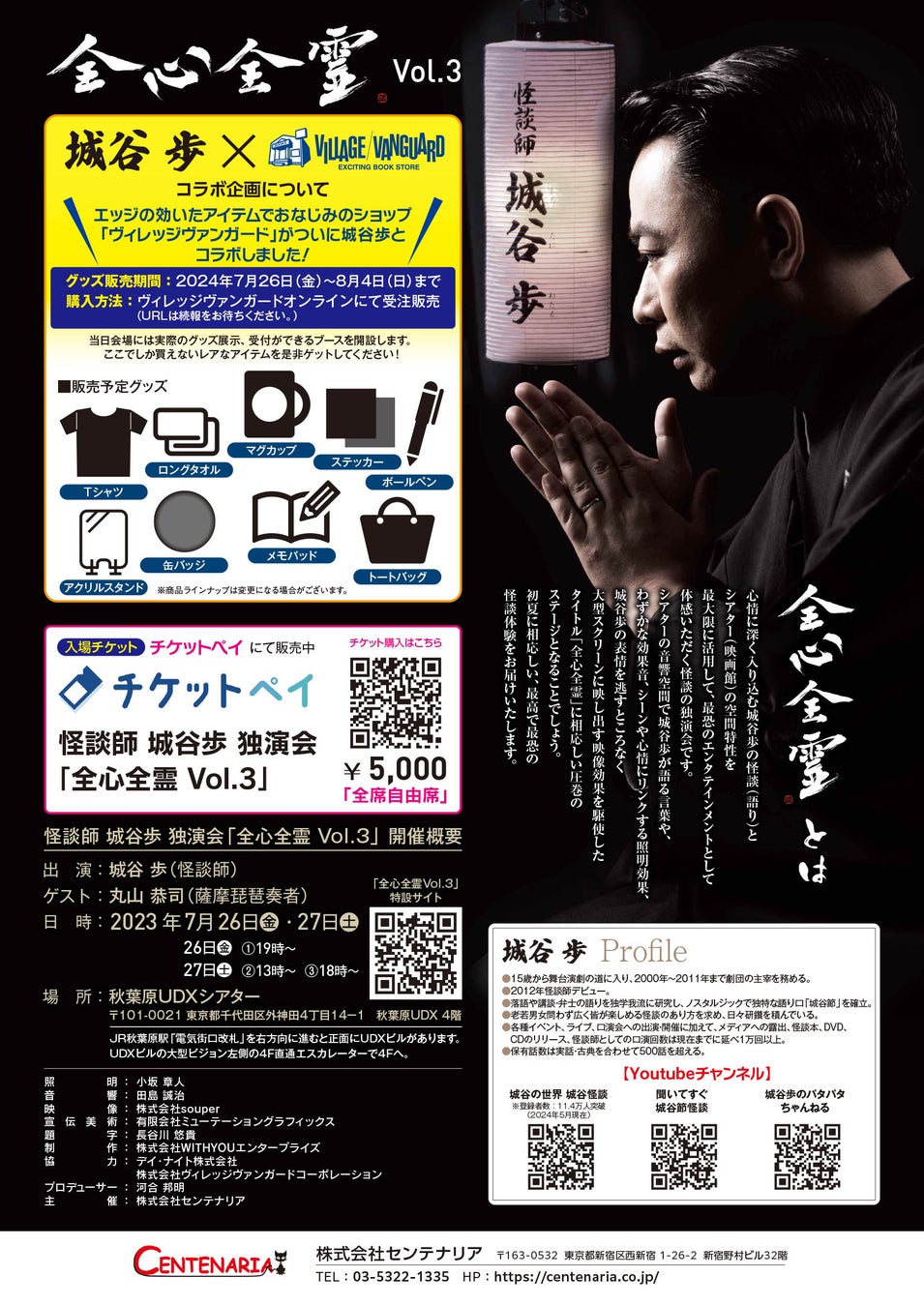 株式会社センテナリア(東京都新宿区、代表取締役:河合邦明)は、2024年7⽉26⽇(金)~27日(土)に秋葉原UDXシアターにて、怪談師城⾕歩の独演会「全⼼全霊 Vol.3」を主催することを決定いたしました。