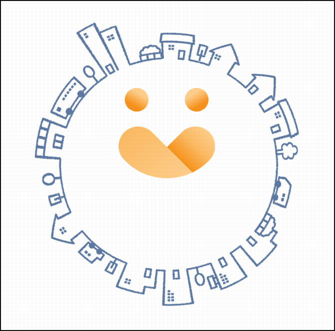 認知症の人も含めてまちで暮らす人々が、お互いを理解し、寄り添いながら、補い合う様子が描かれています。また、その様子が人の顔にも模され、笑顔になっています。