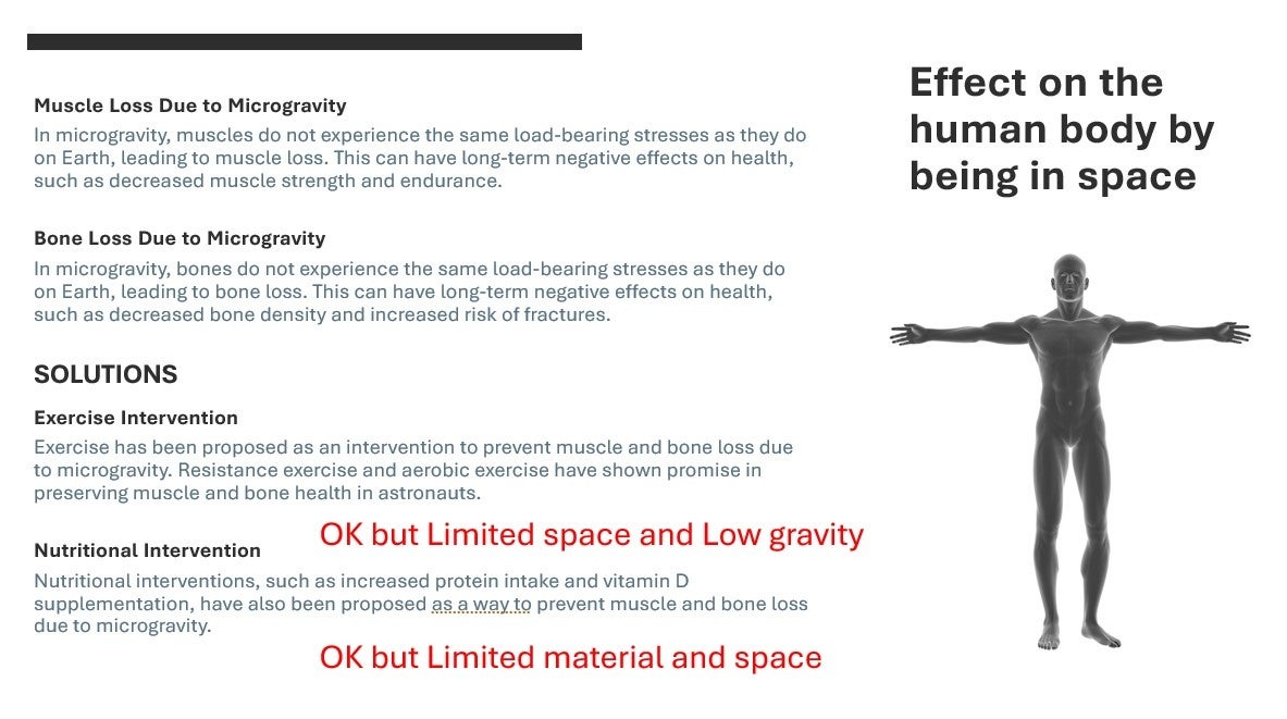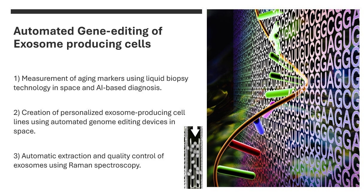 宇宙空間では微小重力や放射線など、地球上とは異なる厳しい環境が存在し、筋肉や骨の減少、細胞の老化促進などが懸念されています。スペースシードホールディングスは、これらの問題に対処するためのソリューションとして、エクソソーム研究の知見を活用した個別化バイオアクティブ薬の開発や、老化が促進されることに抗う遺伝子編集技術の応用に関する可能性について言及しました。