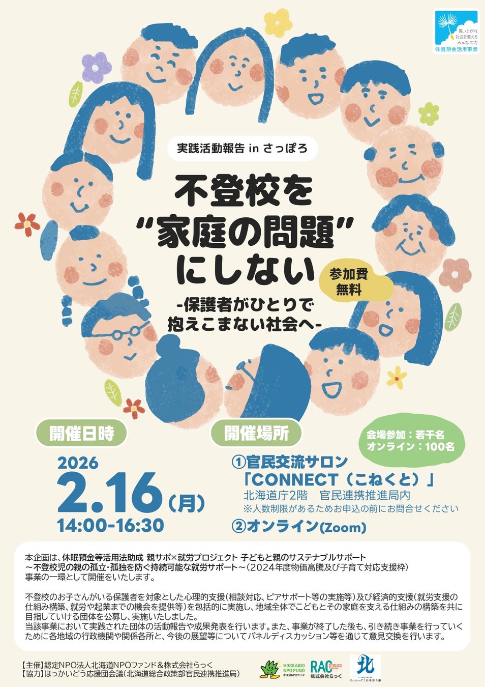 本企画は、休眠預金等活用法助成「親サポ×就労プロジェクト 子どもと親のサステナブルサポート~不登校児の親の孤立・孤独を防ぐ持続可能な就労サポート~」(2024年度物価高騰及び子育て対応支援枠)事業の一環として開催をいたします。