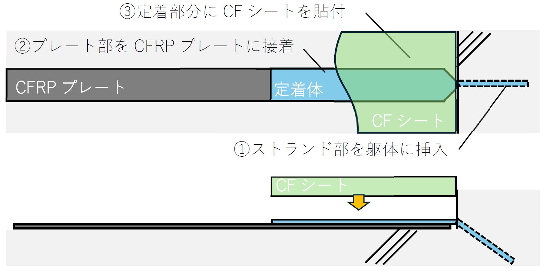 定着方法は、図2に示すとおりで、e-アンカーのストランド部分を束ねた状態でコンクリートに設けた孔内に挿入、プレート部分をCFRPプレートに接着させます。その上に炭素繊維シート(CFシート)を貼り付けます。
