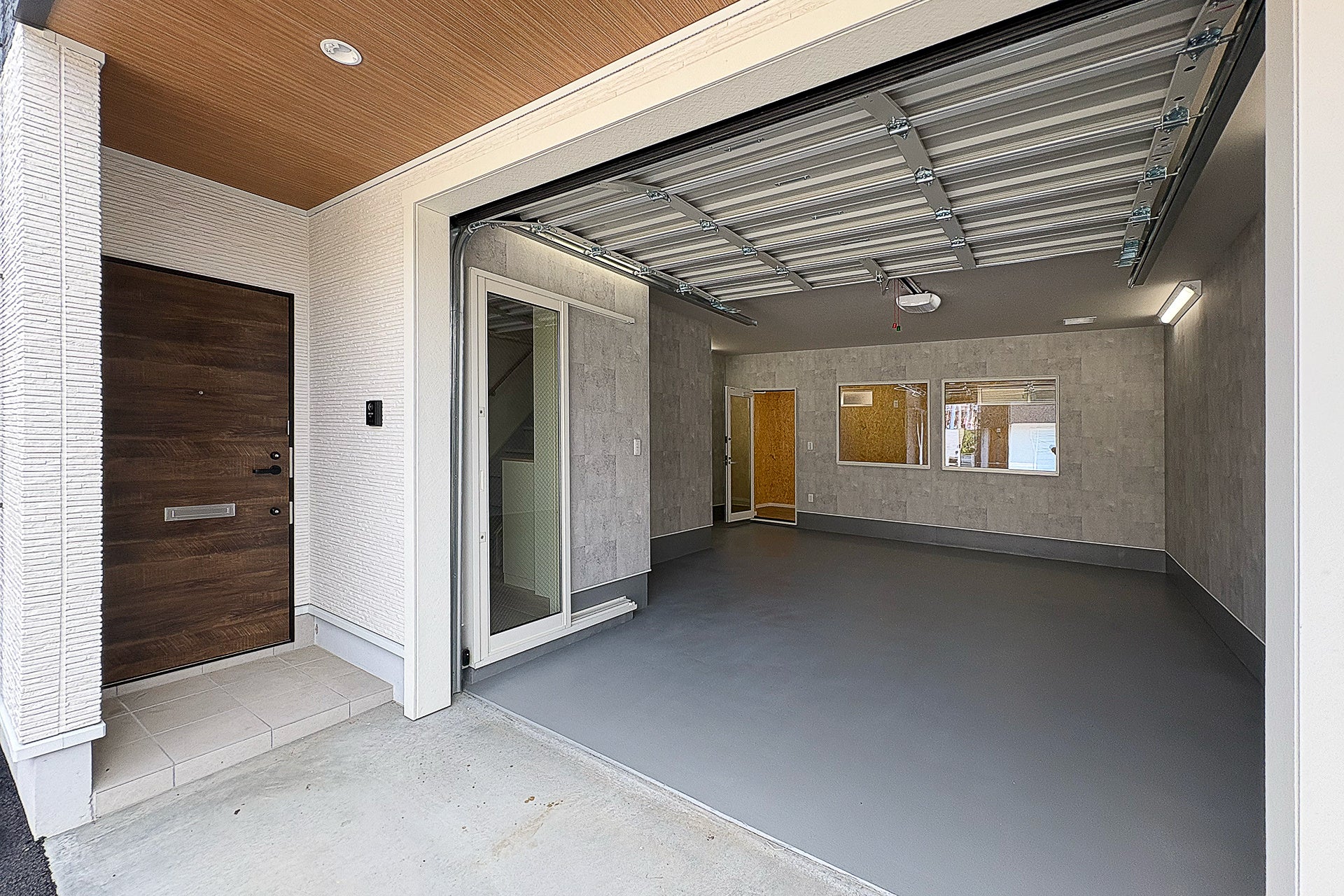 約29.19㎡(約8.83坪、18帖弱)の広さを誇るガレージ部分。高さ2.4mのオーバースライドドアを採用しており、背の高い車両もスムーズに格納可能。開閉音も静かで、日常使いにも配慮された設計です。
