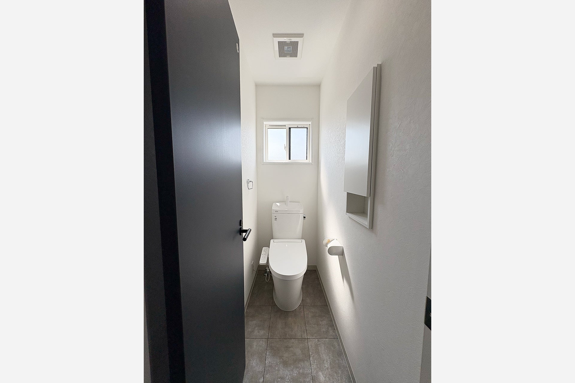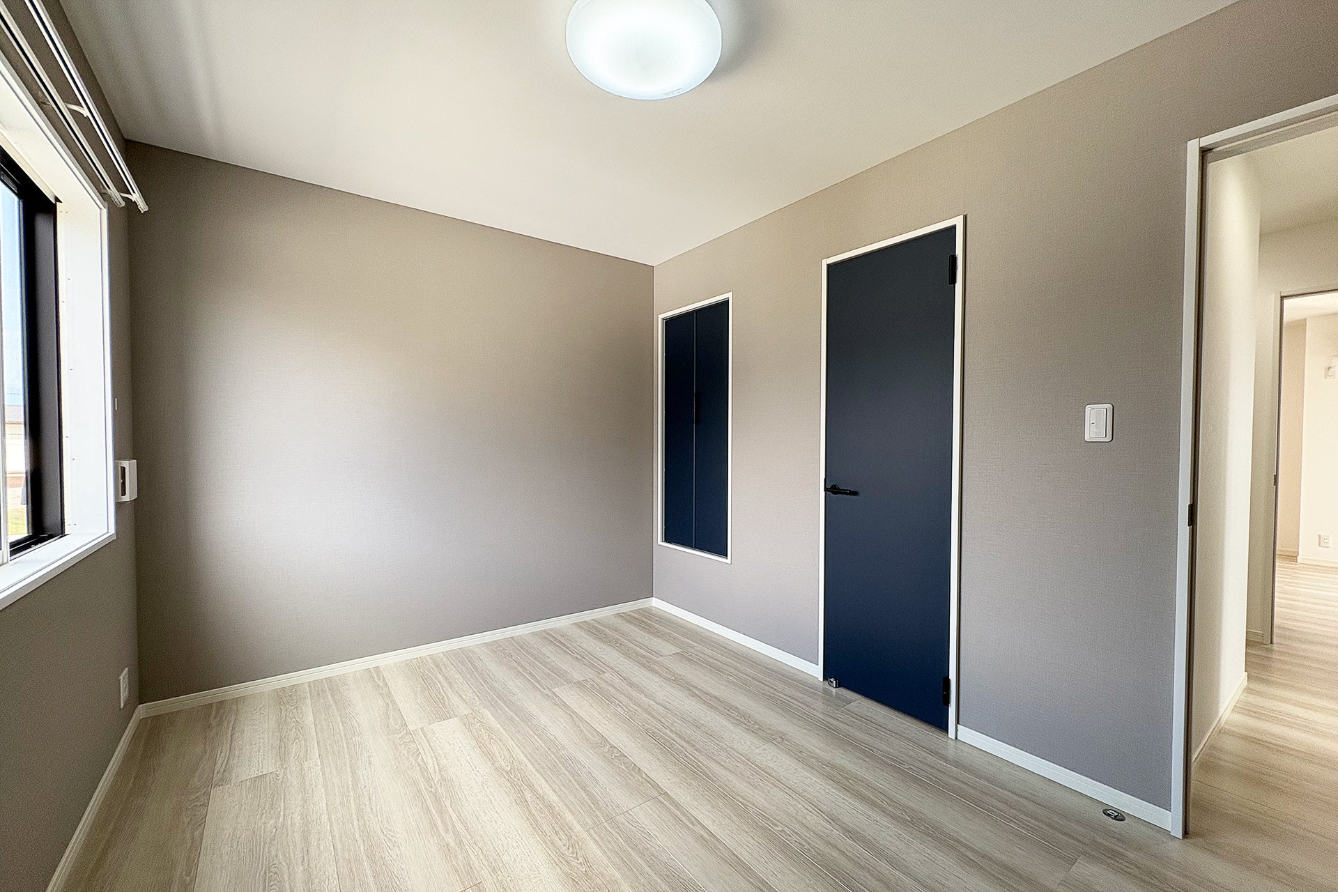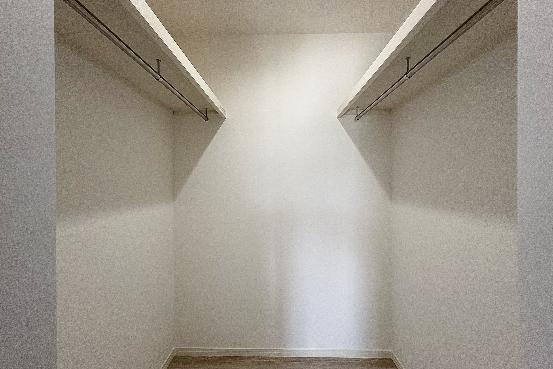 洋室(6帖)には、大容量のII字型ウォークインクローゼットを備え、衣類や生活用品、季節ものなどしっかり収納できます。浴室・洗面室・トイレといった水まわりは2階に集約しており、日々の生活動線もシンプルで使いやすい設計です。