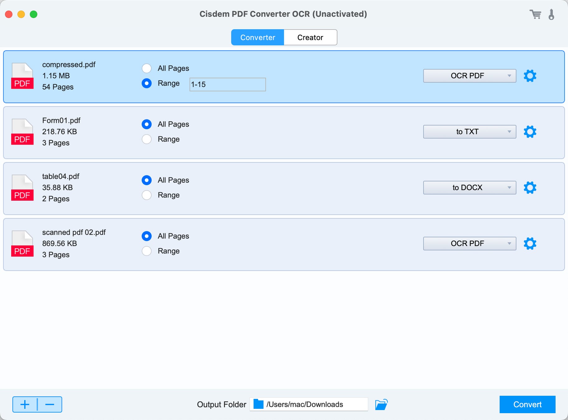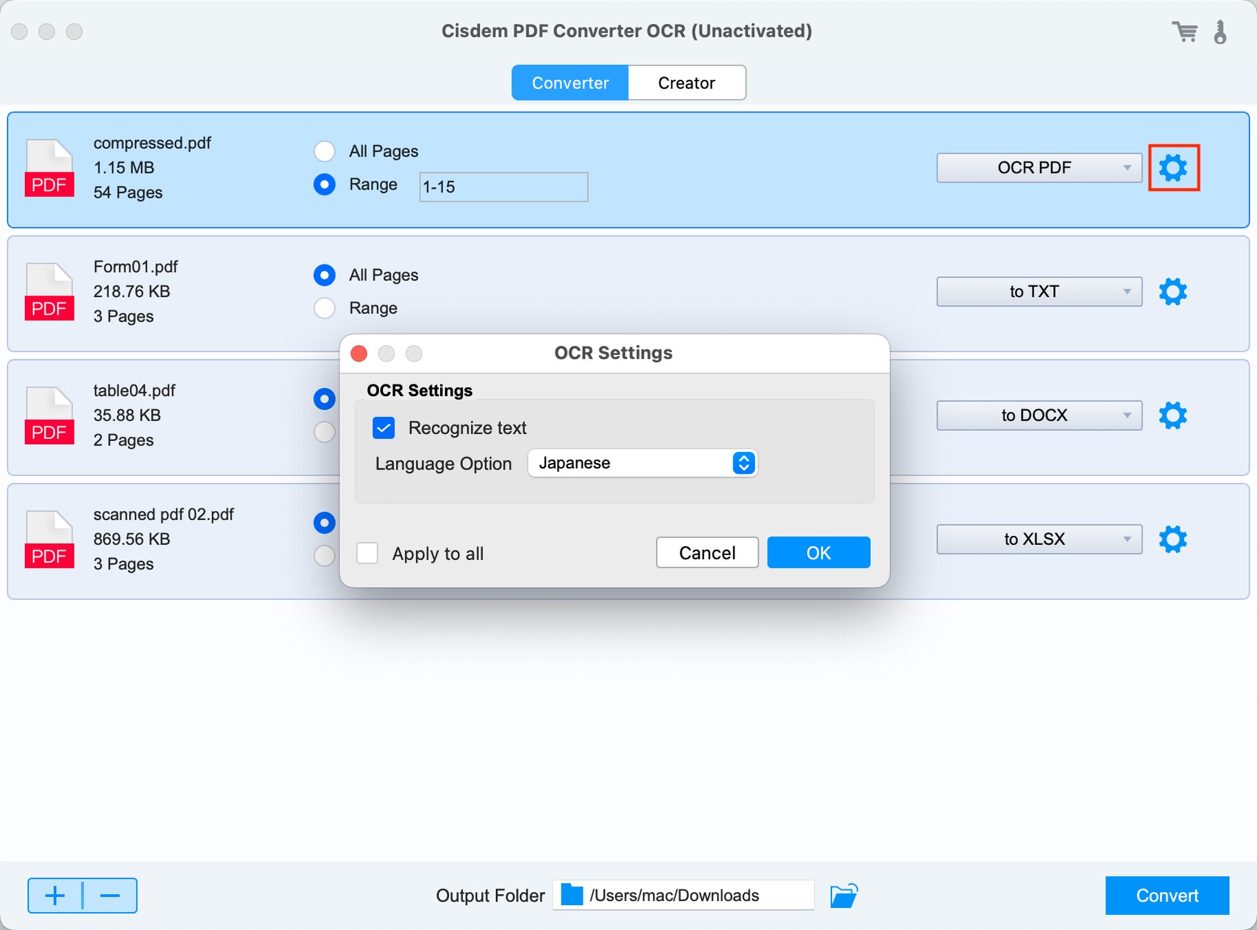 4.「Range」の右で特定のページを変換するのを設定できます。右側のドロップダウンリストから「OCR PDF」を出力形式に設定します。