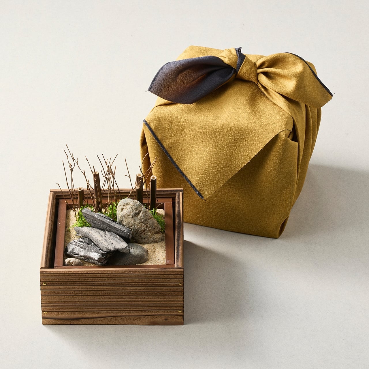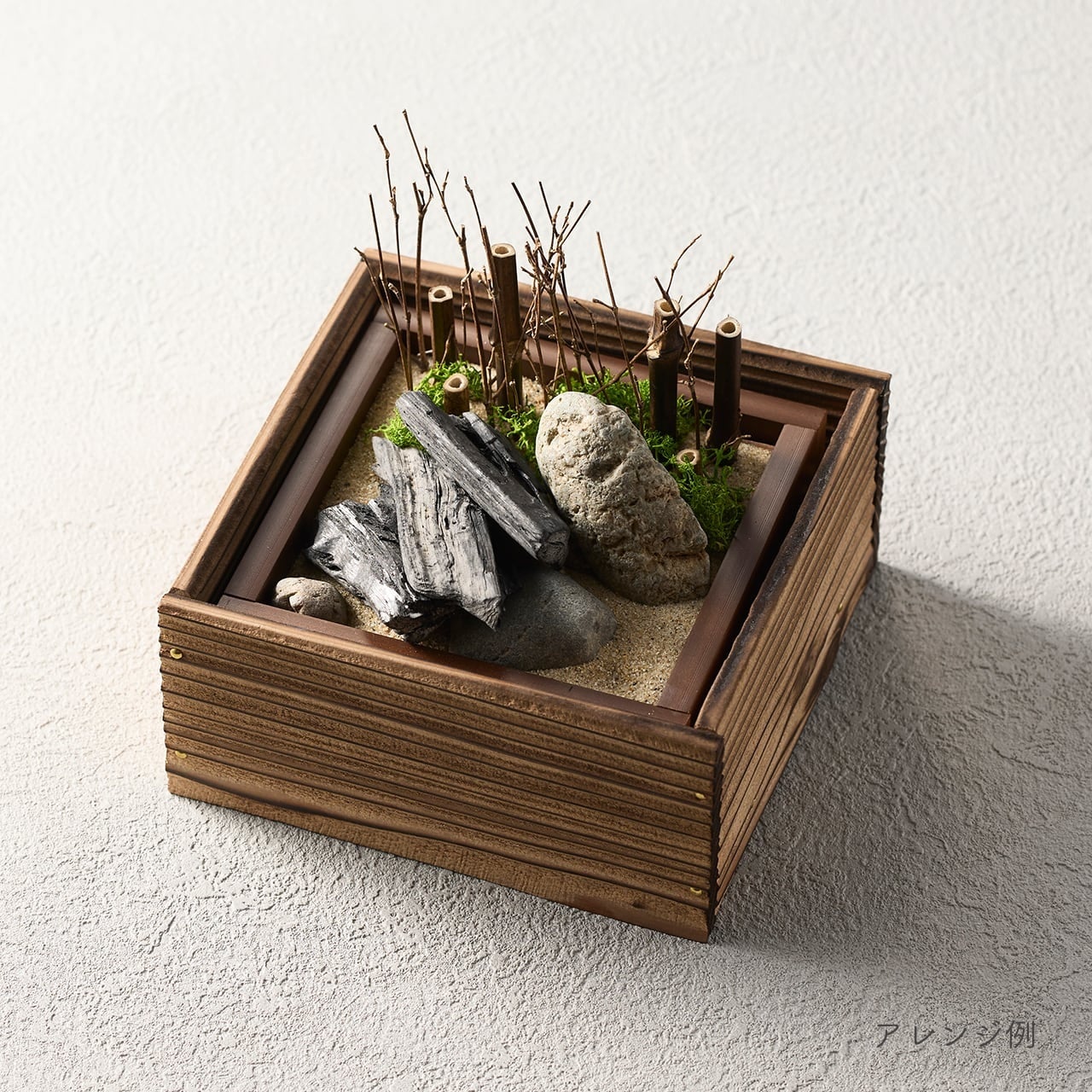 紀州景石と黒竹・穂先の入った焼杉板の箱に、プリザード加工を施したコケと紀州備長炭を盛り付け、幻想的な庭を表現した箱庭です。アレンジ例はございますが、お好きなパーツを配置して、思い描く箱庭を自由にデザインしていただけます。期間中は、ぜひ実際に箱庭を体験してつくる楽しさを味わていただければと思います。ご希望のお客様にはその場で商品をご購入していただけます。ホリデーシーズンの贈り物にもおすすめです。