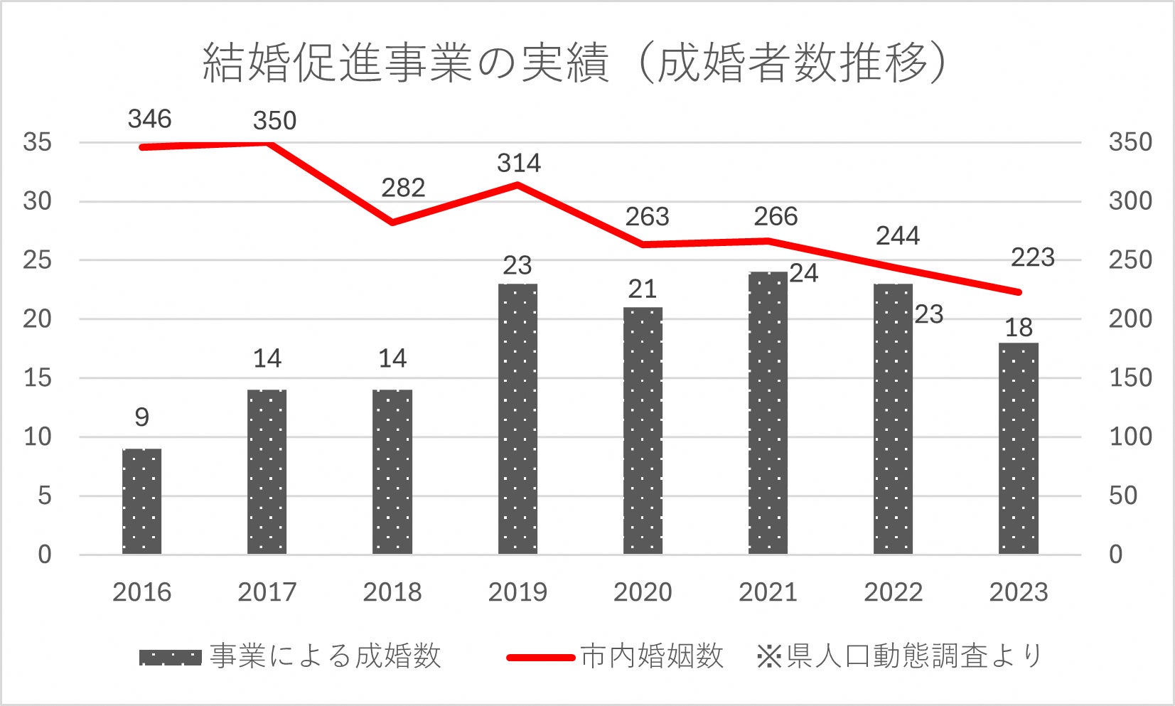 全国的な傾向にたがわず、豊岡市でも若い女性の人口減少に加え、未婚率が近年急激に上昇しています。原因は様々ですが、市ではシンプルに出会いの機会が減っているからであると仮定し、これまでさまざまな出会いの機会を提供してきました。その結果、現在、市の婚活事業に参加して結婚した方は市内の婚姻数の約1割を占めており、一定の成果が出てきたと言えます(下図参照)。この婚活事業をブラッシュアップし、さらに結婚希望者の思いを叶えるために、今回新たに地域プロジェクトマネージャーとして「婚活事業プロデューサー」を起用しました(2024/10/1付着任)。