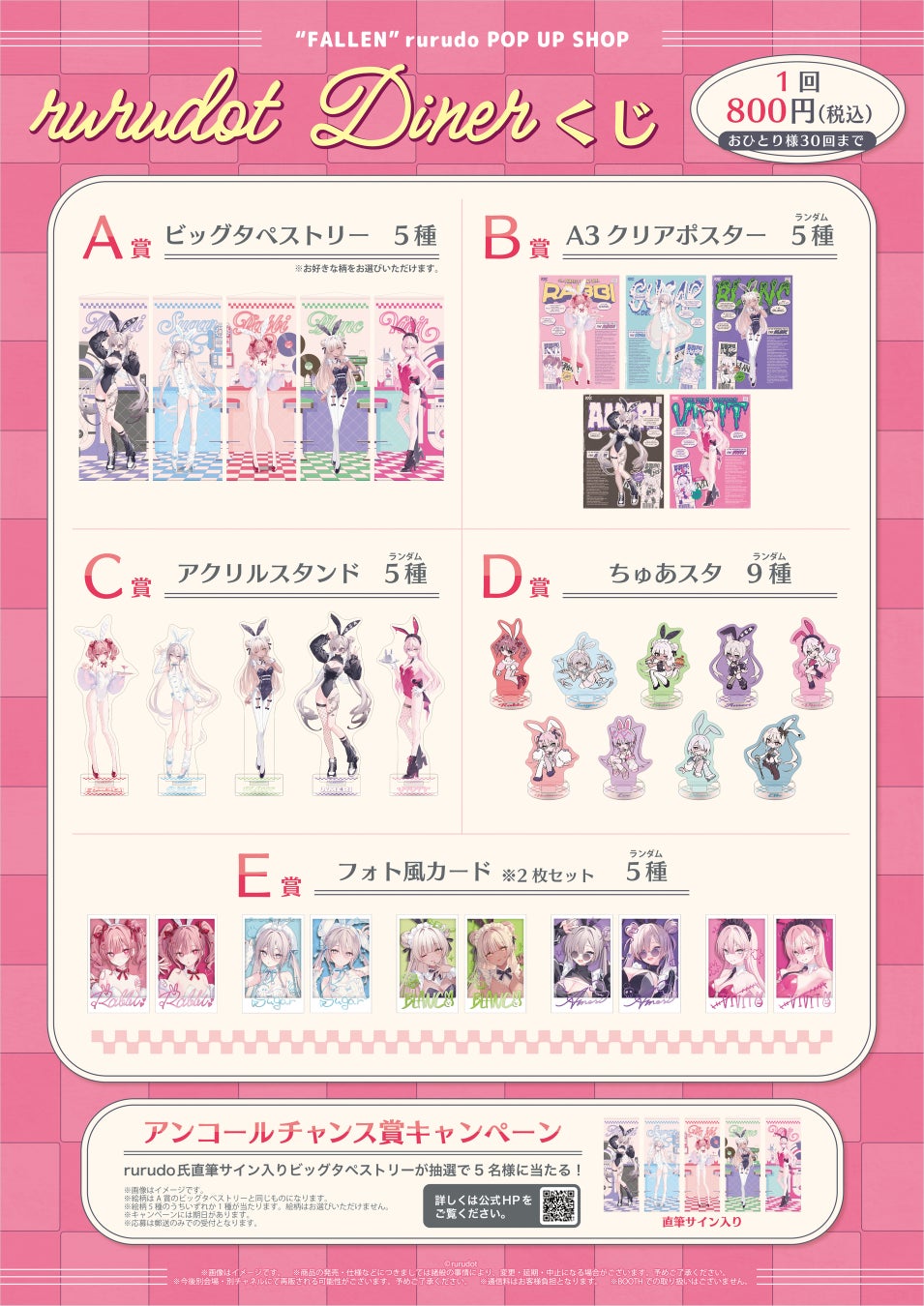 会場2F(Mirror Land)で、rurudo氏考案のオリジナルキャラクター「ラビ」「シュガー」「ブラン」「アメリ」「ビビット」で構成されたバニーガールレストラン「rurudot Diner」のイラストを使用した『rurudot Dinerくじ』を販売します。各賞の他、くじを購入いただき応募条件を満たした方はrurudo氏サイン入りビッグタペストリーが当たるアンコールチャンス賞に参加することができます。