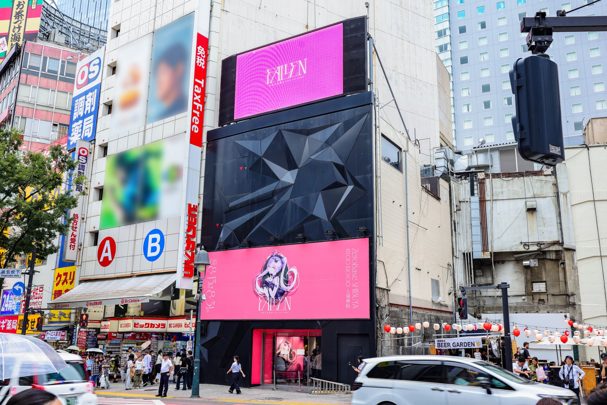 会場の外壁に大きく掲示されたキービジュアルは、rurudo氏のオリジナルキャラクター「イヴ」です。本イベントのためにオリジナル衣装を身にまとった「イヴ(JOKER Ver.)」をrurudo氏が描き下ろしました。ドア周りはイベントのキーカラーである鮮やかなピンクが彩ります。また、会場であるZeroBase渋谷の屋上ビジョンで本イベントのPV映像を放映いたします。