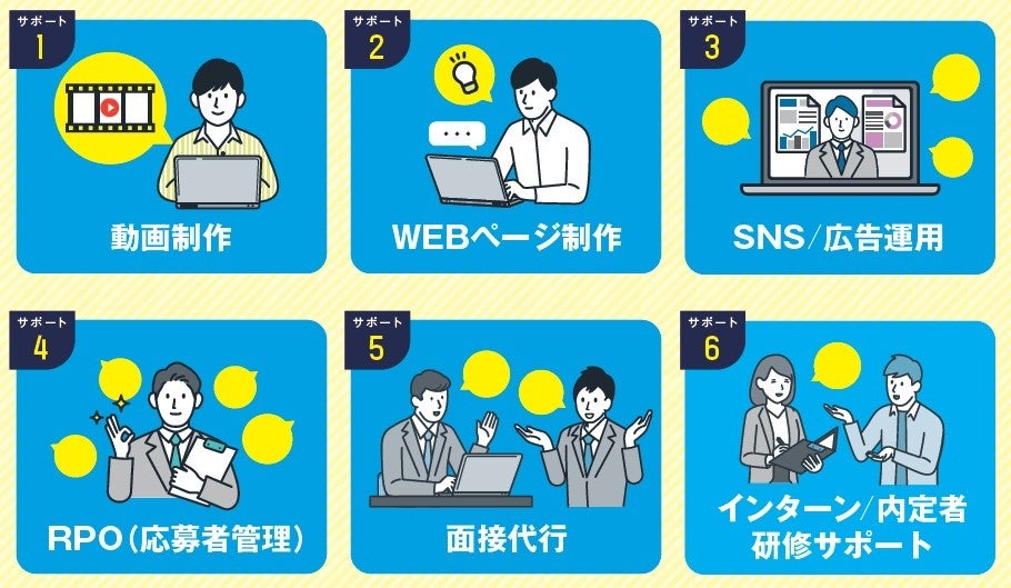 一般的な採用代行に留まらず、WEB ページや動画の制作で応募者へのPRを行い、インターンや内定者研修といったイベント対応のサポートまで幅広く対応いたします。
