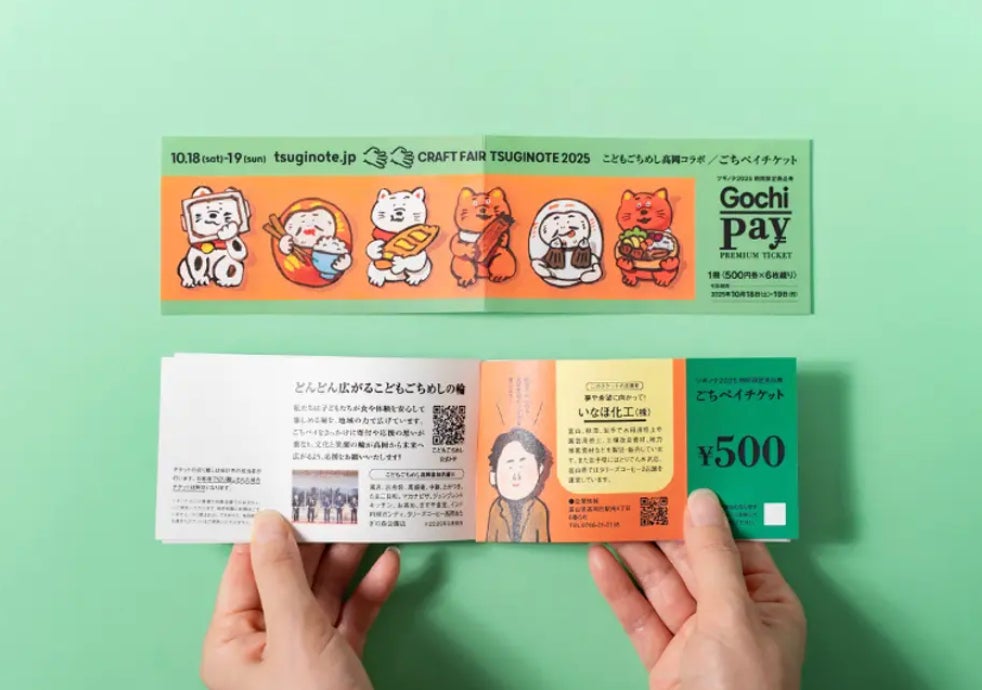 経済的に機会が限られる家庭や子育て世代へ、ツギノテに関連した購買・体験で利用できるチケット「ごちペイ」を400部配布。ベビーファーストこどもごちめし高岡プロジェクトとの協業により“文化的体験の格差解消”に取り組む企画。ごちペイを使用した子どもや保護者からは、体験への感謝の声が多く寄せられました。