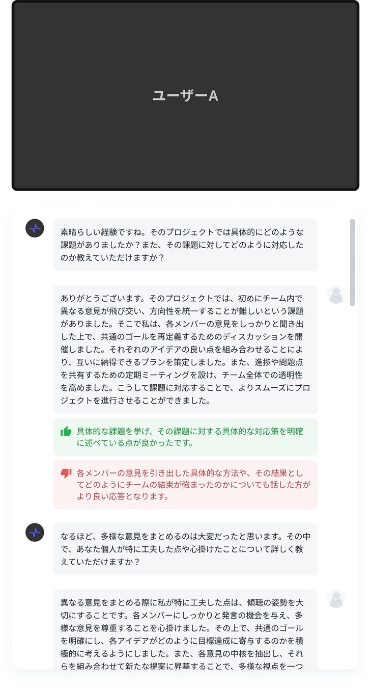 また、面接終了後にはAIがその場で講評を提示し、候補者自身も成長に活かせる学習体験型の選考プロセスを実現しています。