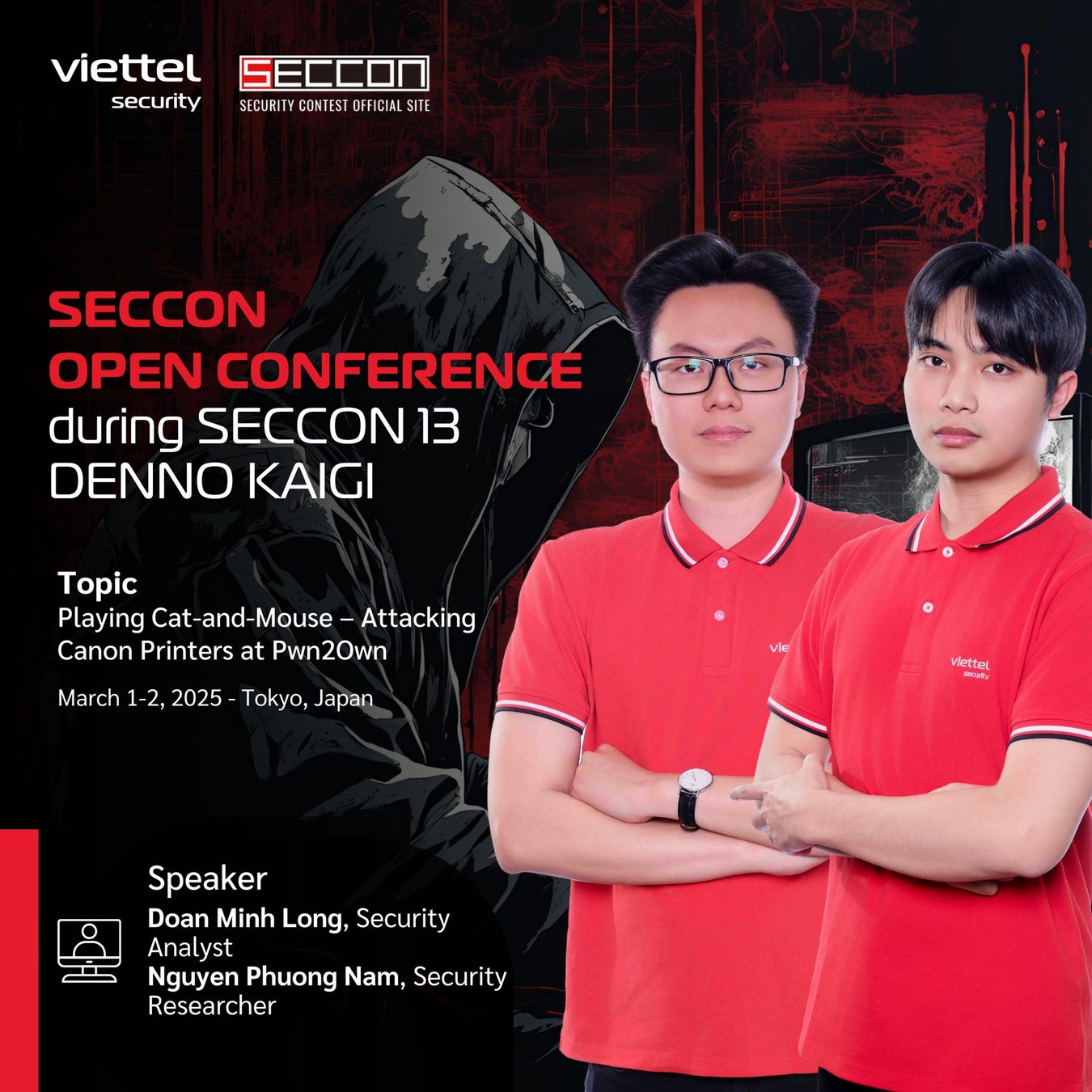 2025年3月1日~2日、東京で開催されたSECCON Open Conference(SECCON 13 電脳会議)において、ベトテルサイバーセキュリティ (VCS) のドアン・ミン・ロン氏とグエン・フオン・ナム氏が登壇し、「Playing Cat-and-Mouse – Attacking Canon Printers at Pwn2Own」と題した講演を行いました。本講演では、キヤノンプリンターのセキュリティ脆弱性に焦点を当て、現代のデバイスセキュリティが抱える課題と、進化し続ける脅威に対するサイバーセキュリティ研究者の戦いを詳細に解説しました。