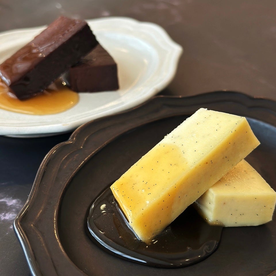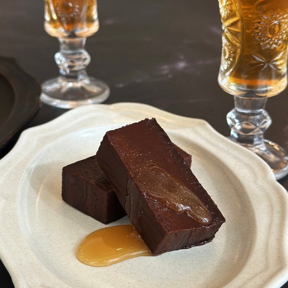 また、2種類のテリーヌにはウイスキーの香りをそのまま閉じ込めた琥珀色のソースが付属しています。まずはテリーヌそのもののお味を楽しんでいただき、その後ウイスキーソースをかけてお召し上がりください。芳醇なウイスキーの風味をまとった極上のテリーヌへと変貌を遂げます。甘いものが苦手な方にもおすすめのスイーツです。