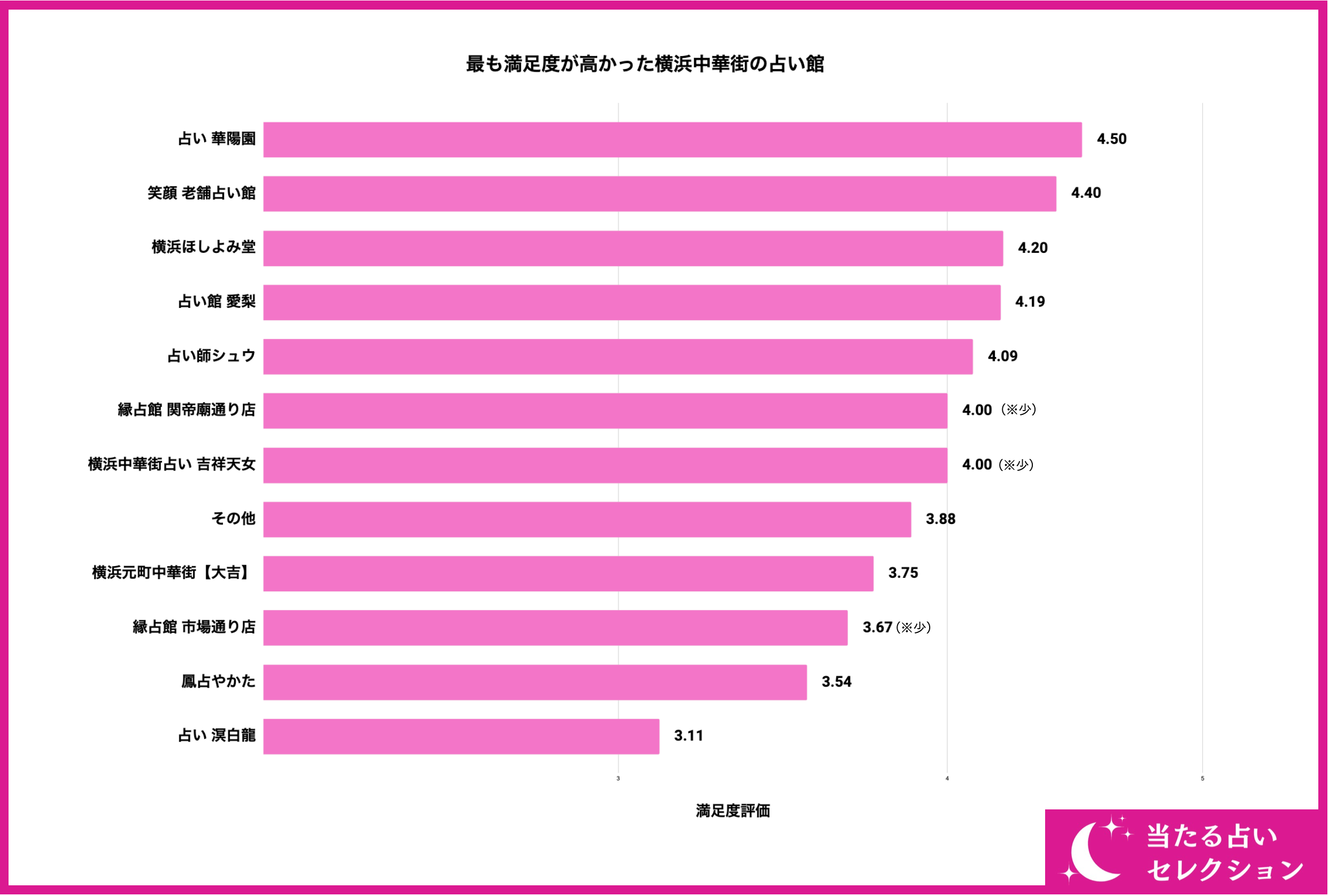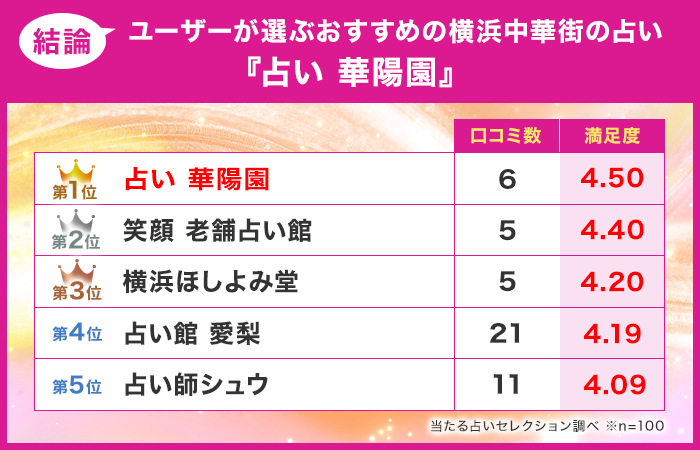 100名の独自アンケートの結果、ユーザーが選ぶ横浜中華街でおすすめの占い店舗、第1位は「占い 華陽園」となりました。満足度評価「4.50/5.00」とユーザーからの評価が高く、『占い 華陽園』の実力が高いことを証明していると言えるでしょう。