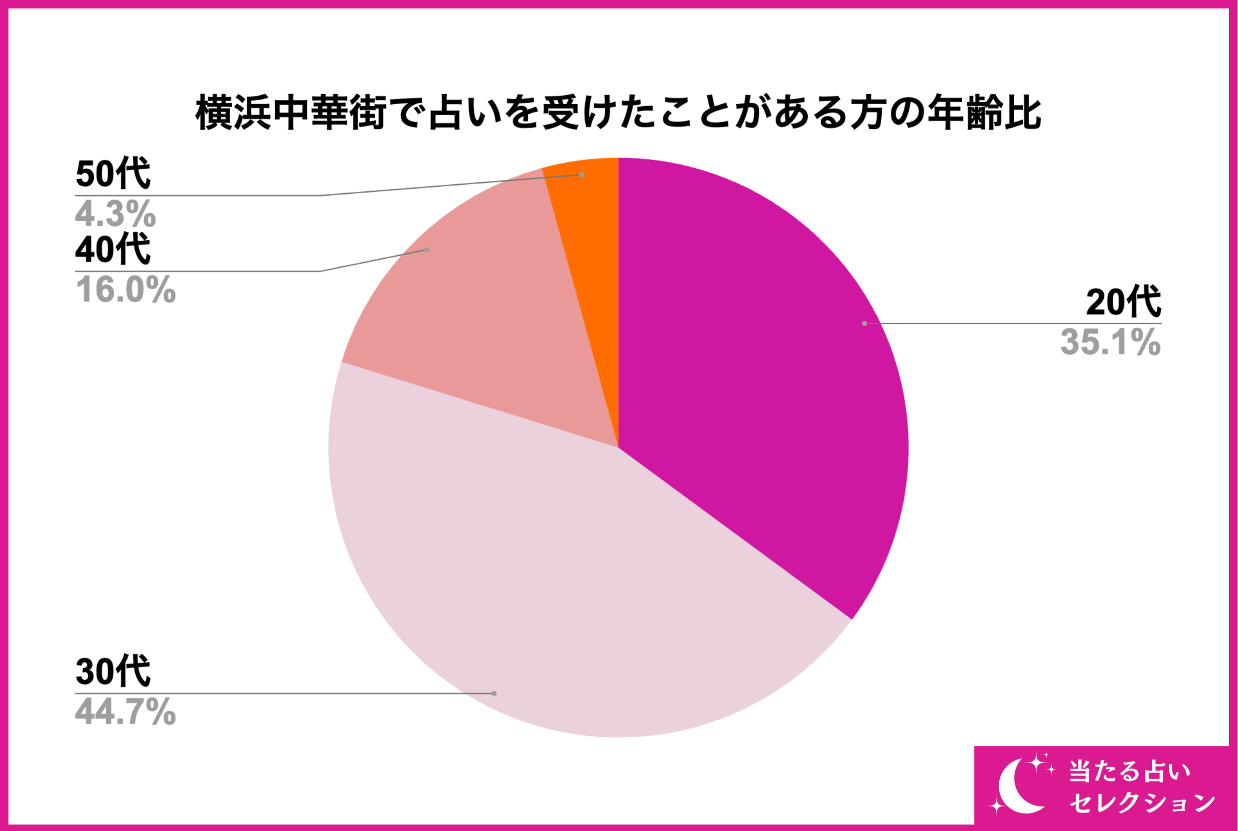 続いて、横浜中華街で占いを受けたことがある方の年齢比率ですが、画像の通り、20代〜40代がメインとなっています。中でも、30代の利用者数が全体の42%とかなり多くなっています。30代になると使えるお金が多くなったり、悩み事も増えてくるため占い師にお願いする人が多いのかもしれません。