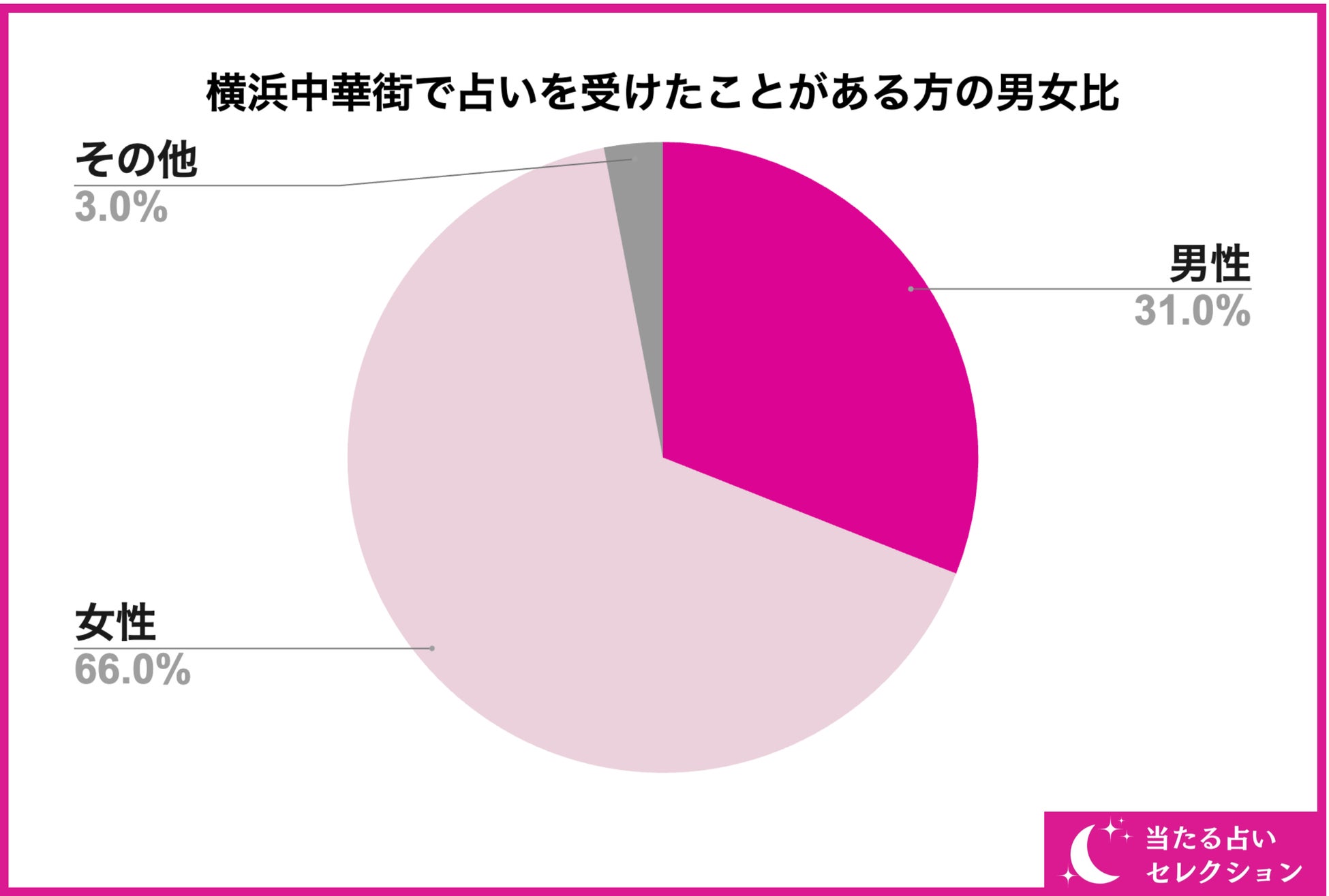 まず初めに、横浜中華街で占いを受けたことがある方の男女比についてご紹介していきます。横浜中華街で占いを受けたことがある男女の比率は画像の通り、男性が約31%、女性が約66%の結果となりました。占いを利用する人は女性が多数というイメージを持っている方も多いかと思いますが、実際も約66%(半分以上)が女性という結果になりました。