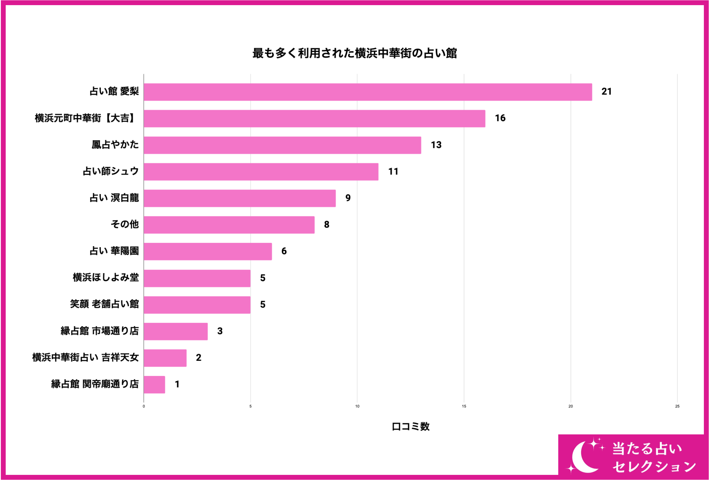 続いて、100名の利用者のうち最も多く利用された横浜中華街の占い店舗をご紹介していきます。結論から言うと、『占い館 愛梨』や『横浜元町中華街占い館【大吉】本店』といった有名な占い店舗が上位となりました。口コミ数が多い占い店舗は、色々な記事や特集で見ることも多く、認知度や知名度が高いためより利用者数も多くなっていることが考えられます。