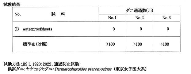 2025年11月7日付けで行われたダニ通過性試験では、約100匹を用いた評価で通過ダニ数0匹を確認し、通過率0%という結果が得られました。(試験方法:JIS L 1920:2022、通過防止試験)