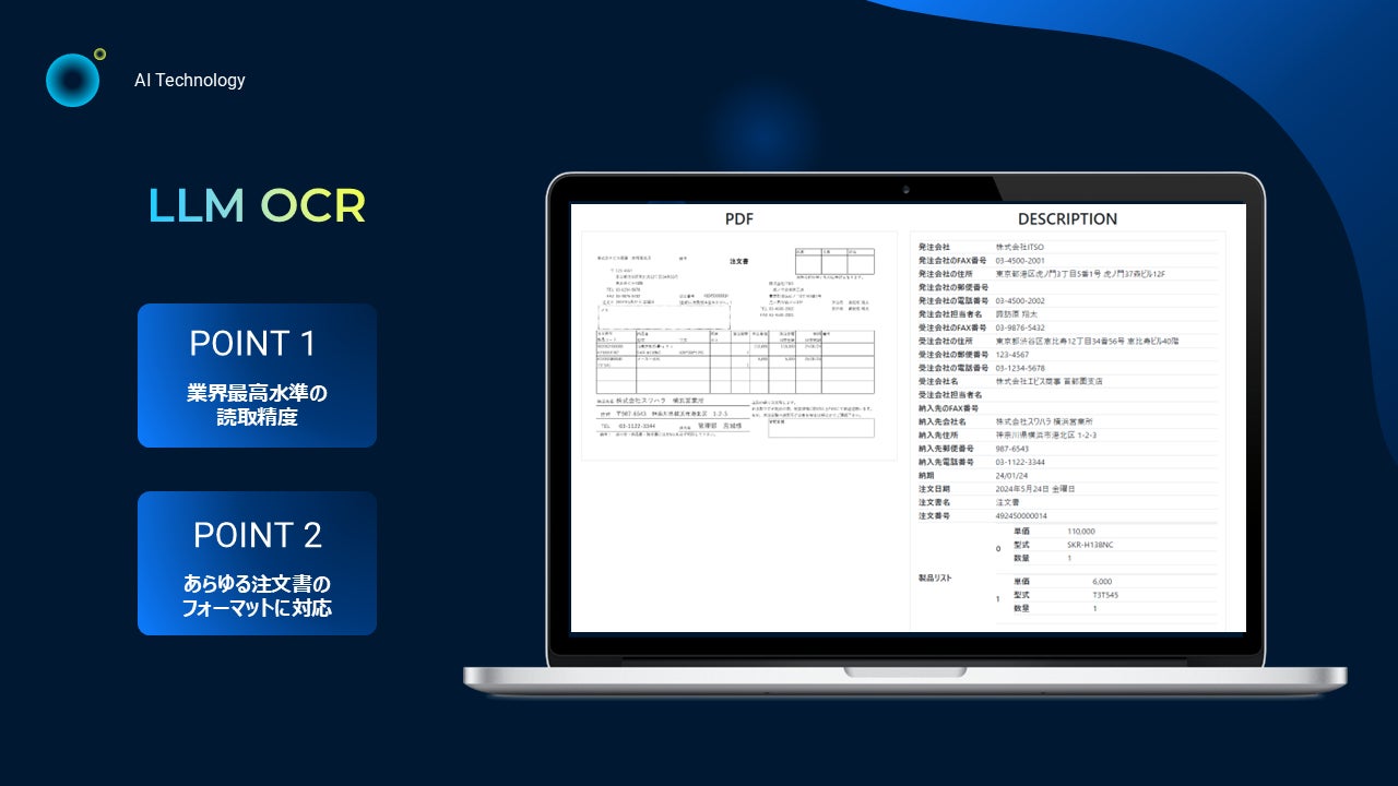 株式会社ITSO(本社:東京都港区、代表取締役:北川 伸一、深野 靖浩、以下 ITSO)は、世界最先端のLLM技術を採用した注文書に特化し、手間やミスが多い入力作業を大幅に削減し、新たな生産性を切り拓く画期的ソリューションの提供を開始しました。。