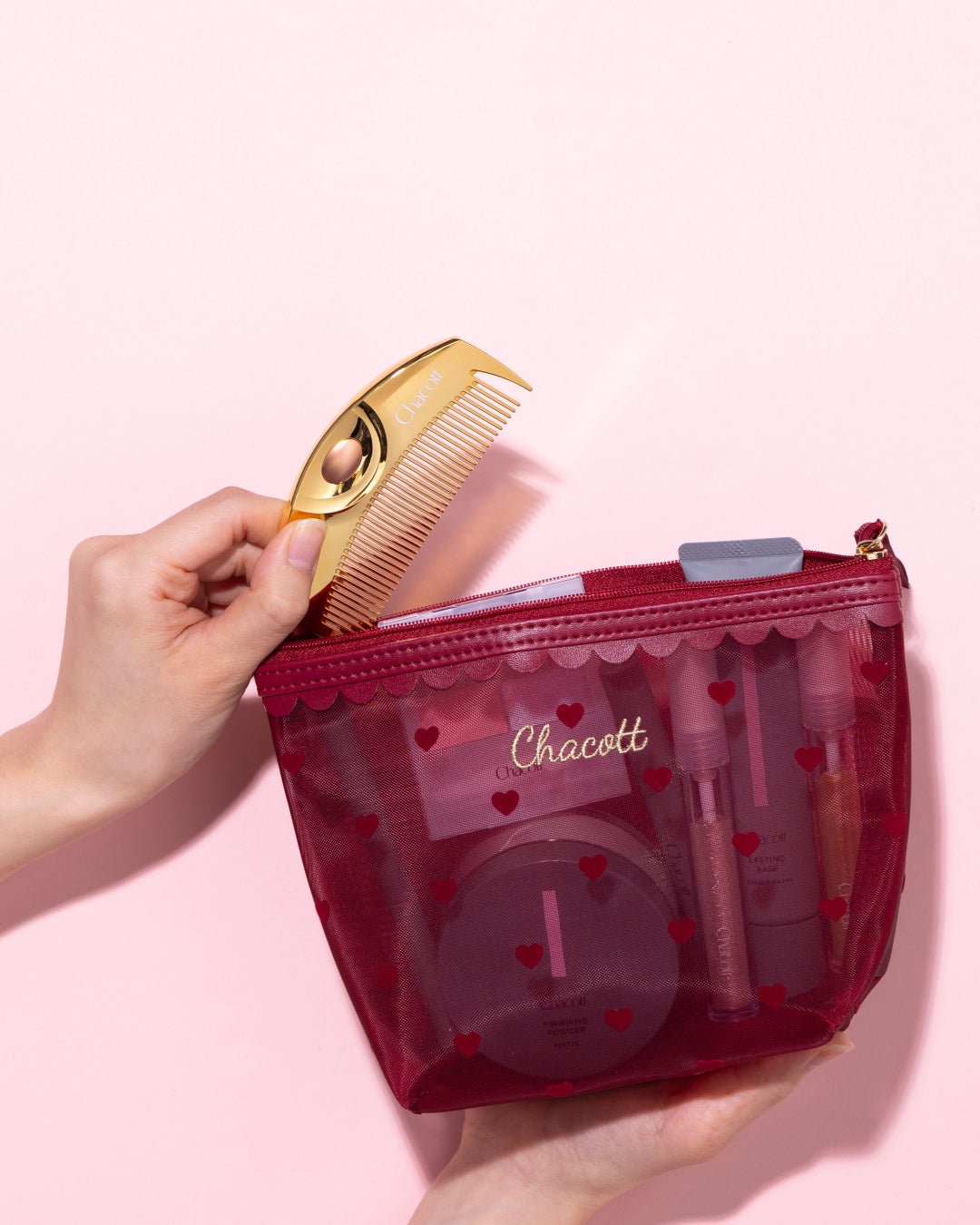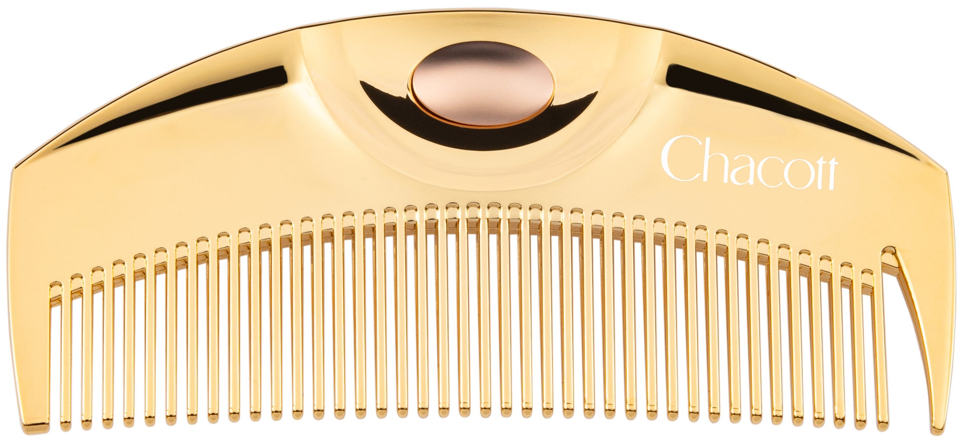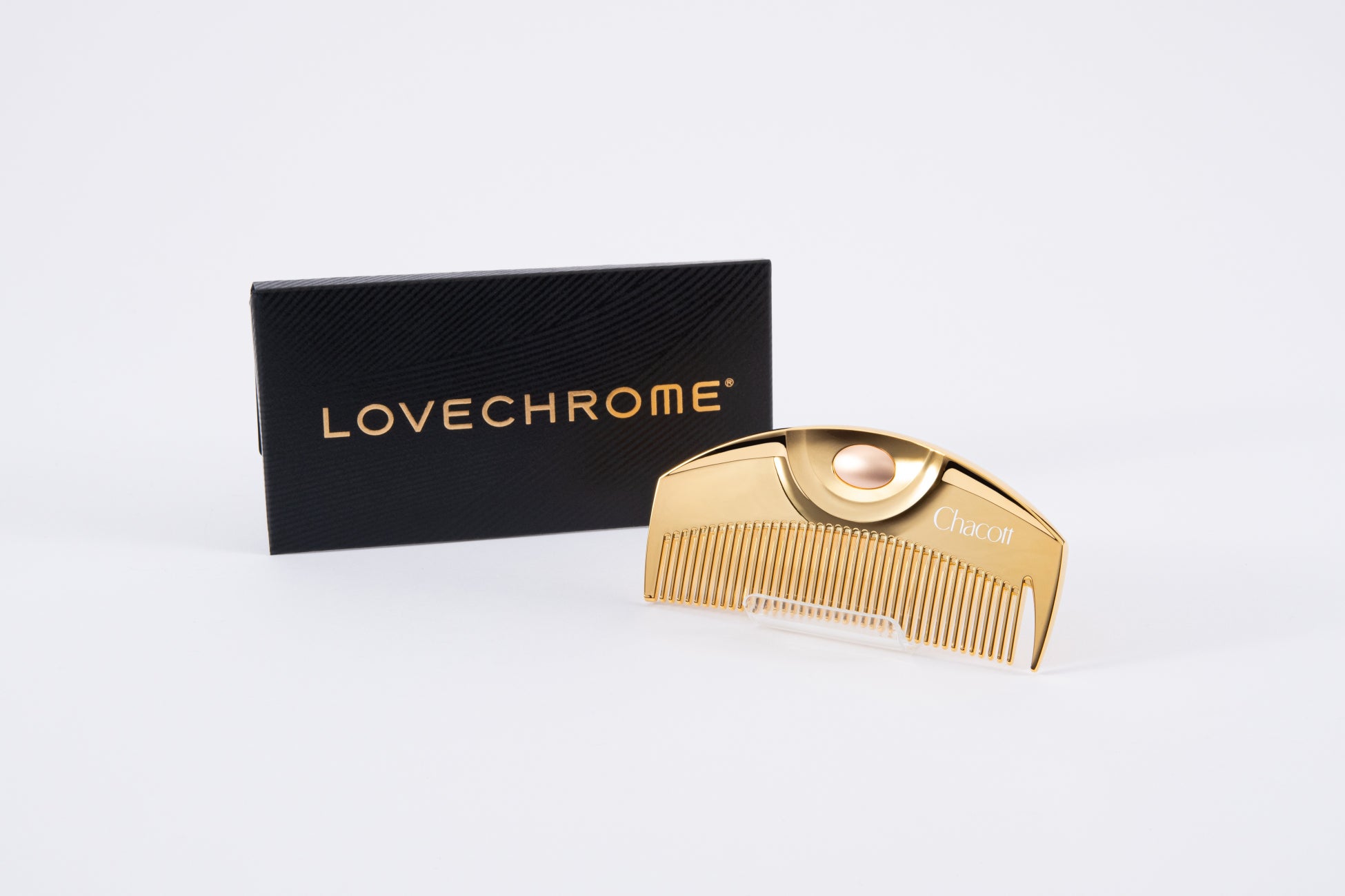 今回の限定モデルは、ラブクロムの大人気モデル「K24GPツキ ゴールド」にローズゴールド色のボタンを使用し、華やかさの中に上品さをポイントで加えました。コーム表面にはChacott の特別ロゴ入り。
