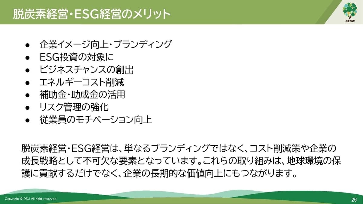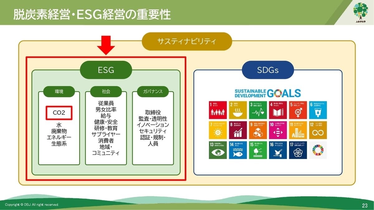 欧州はこのESG経営が進んでいまして、日本国内でも欧州企業と取引のある企業は、ESG経営の具体的な取り組みを進めるよう、具体的な要請が来ています。それはCO2を減らすだけで応えられるものではないのです。