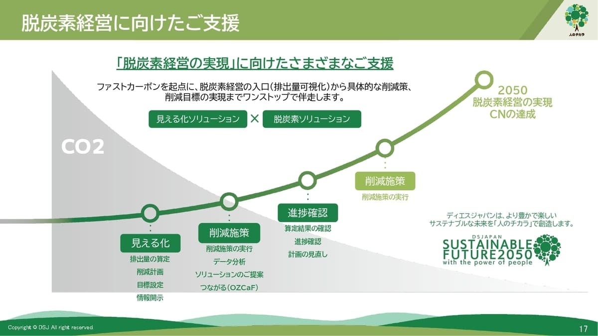 ディエスジャパンでは、これまでリユーストナーを通じて、全国に約7万社のお客様がいらっしゃいます。そのほとんどは中小企業です。まだ脱炭素に取り組めていない中小企業に対し、【二酸化炭素排出量の見える化】から、【削減対策】【進捗確認】まで、脱炭素経営の実現に向け、ワンストップでご支援できる体制を構築しました。