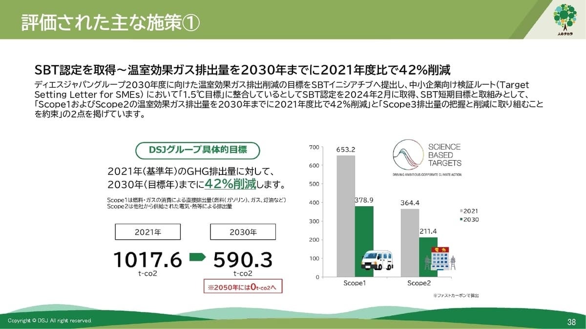 まずはSBT認定を取得したことです。CO2削減の具体的な取り組みとしては、工場に太陽光発電を導入しました。これにより工場の電力は6割ぐらい自家消費しています。また2024年10月にはディエスジャパン本社の使用電力を再生可能エネルギー100%のプランに切り替えました。これにより、約9.6%程度の排出削減を実現しました。