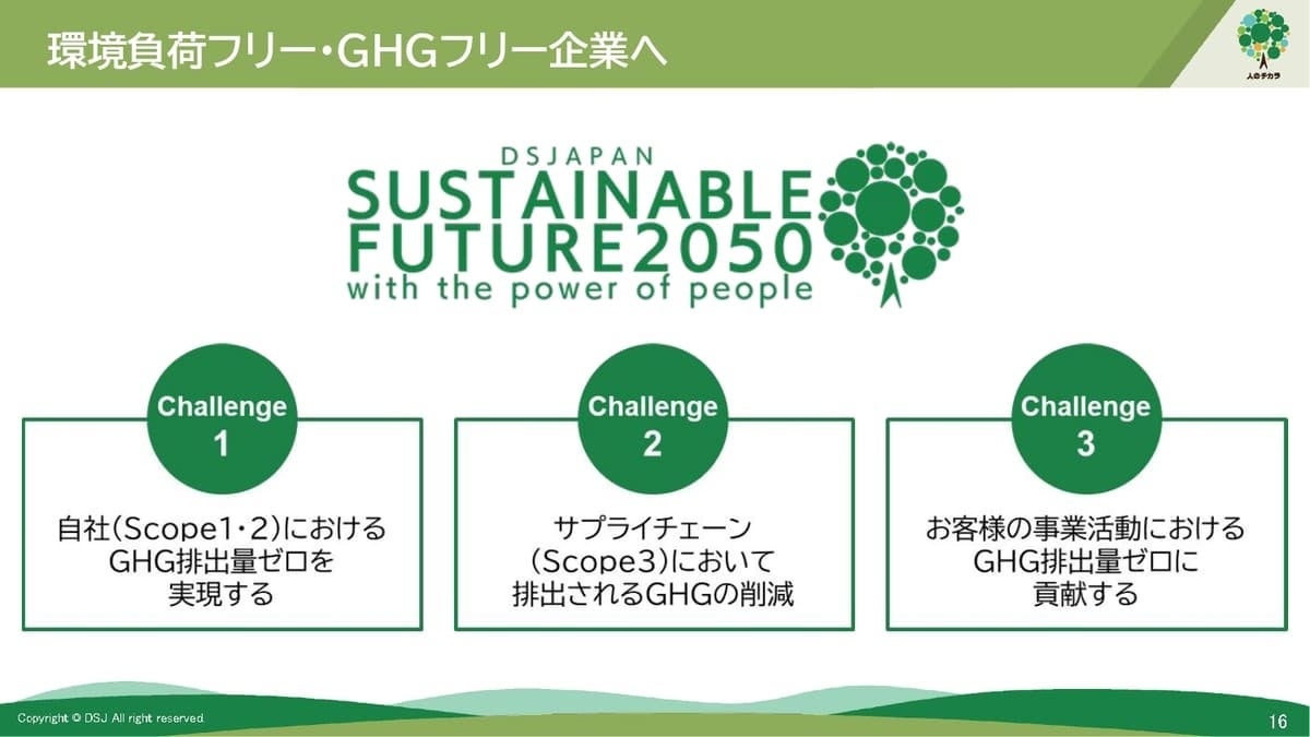 ディエスジャパンの中長期経営計画の中には、3つのチャレンジを盛り込んでいます。特に、自社だけで脱炭素を行うのではなく、チャレンジ3「お客様の事業活動におけるGHG排出量ゼロに貢献する」を掲げたことがポイントです。