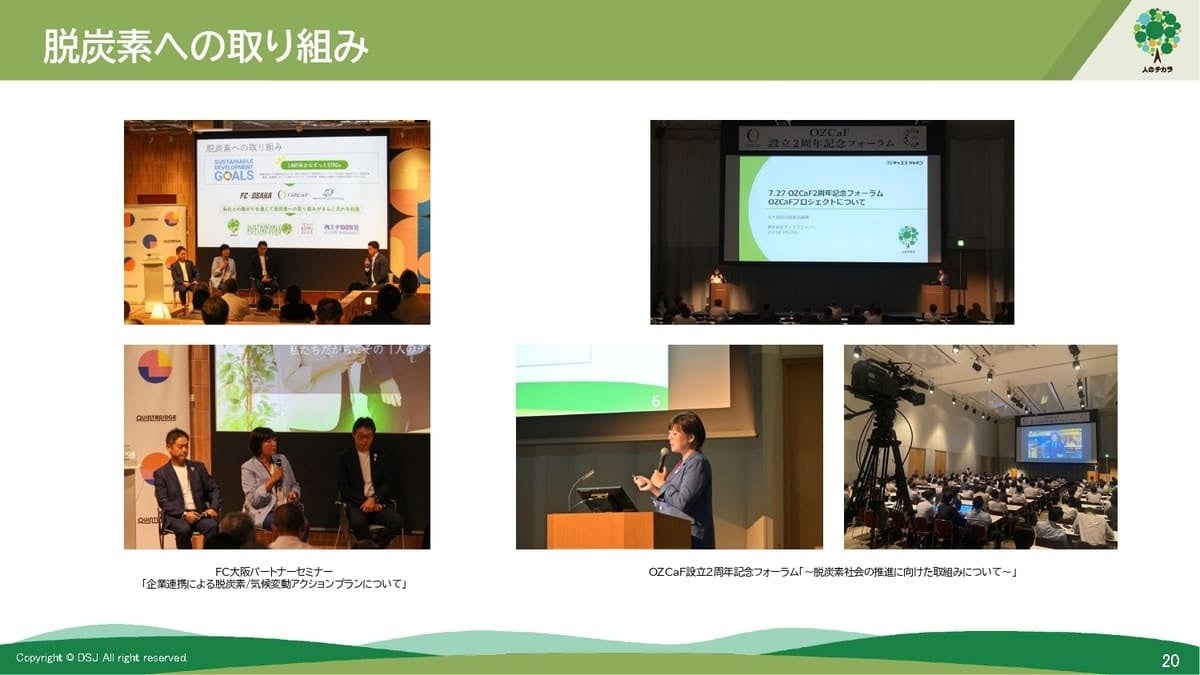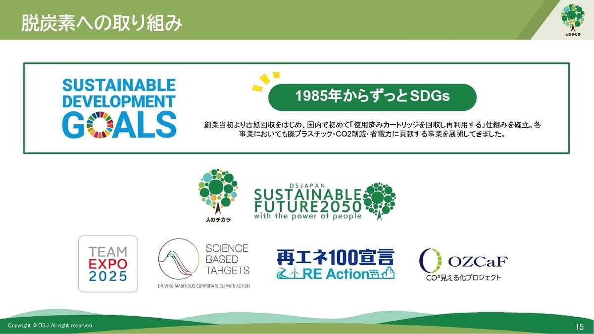 そこでリユーストナーの環境価値を高めるために、創業当初からディエスジャパンがSDGsへ取り組んでいることを表すロゴ(上図の中央)を作成しました。また、チームエキスポ2025や再エネ100宣言 RE Actionへの参加、OZCaF(OSAKA ゼロカーボン・スマートシティ・ファウンデーション)の会員企業としての活動もスタートしました。
