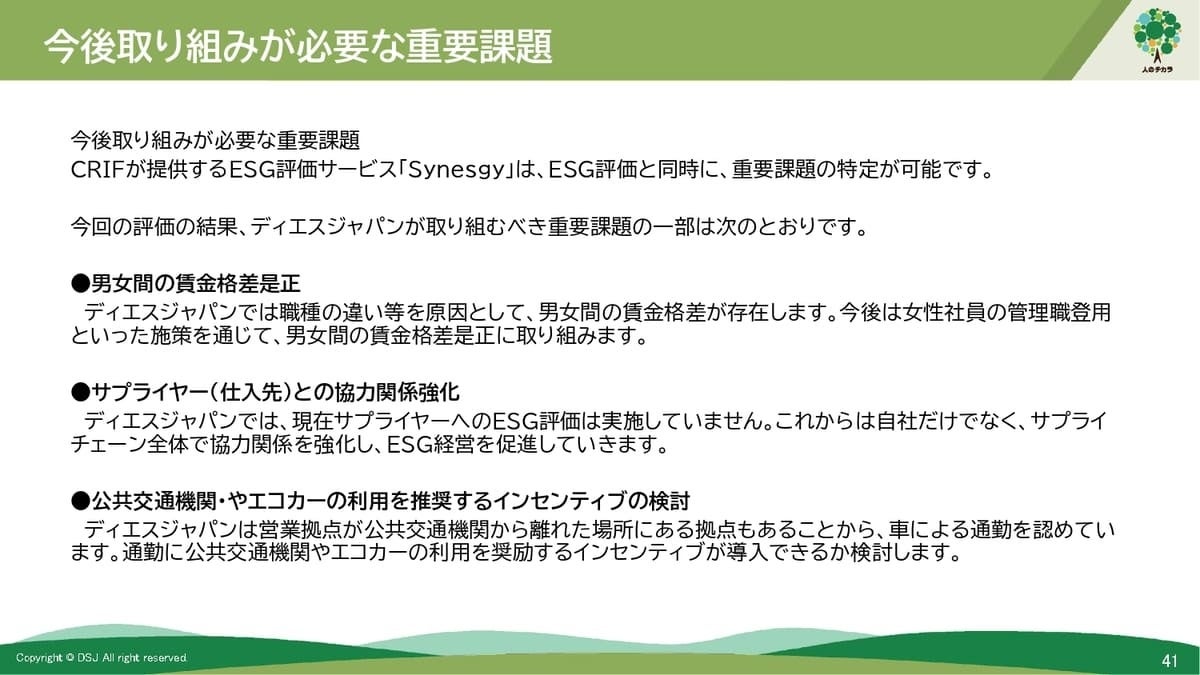 株式会社ディエスジャパン(本社:大阪府東大阪市、以下「ディエスジャパン」)代表取締役の北條陽子は、2024年12月16日に都内で行われたセミナー「CRIF Japan Seminar for Synesgy」に登壇しました。北條がディエスジャパンの代表に就任した2019年から取り組んできた自社のESG経営についてや、欧州のESG規制動向、CRIF JapanのESG評価サービス「Synesgy」の活用についてお話ししました。
