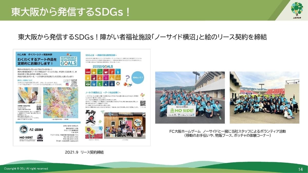当社が拠点を置く東大阪市でも、ダイバーシティ推進の取り組みを進めています。ディエスジャパンは同じ東大阪市を拠点に置くサッカーチーム・FC大阪とトップパートナー契約を締結しています。FC大阪を通じて東大阪の障害者福祉事業所「ノーサイド」と連携し、ボランティア活動などを行っています。