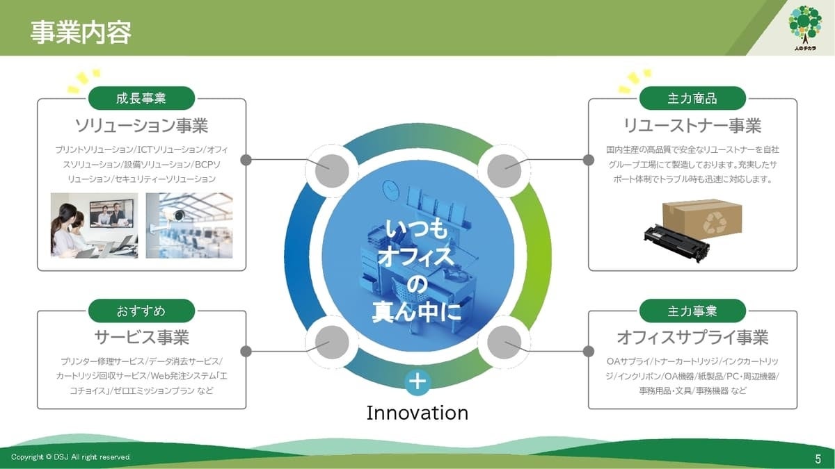 ディエスジャパングループは、リユーストナーの製造販売を中心に、オフィスから環境負荷低減と持続可能な社会の実現に貢献する企業です。東大阪に拠点を置き、来年創業40年を迎えます。
